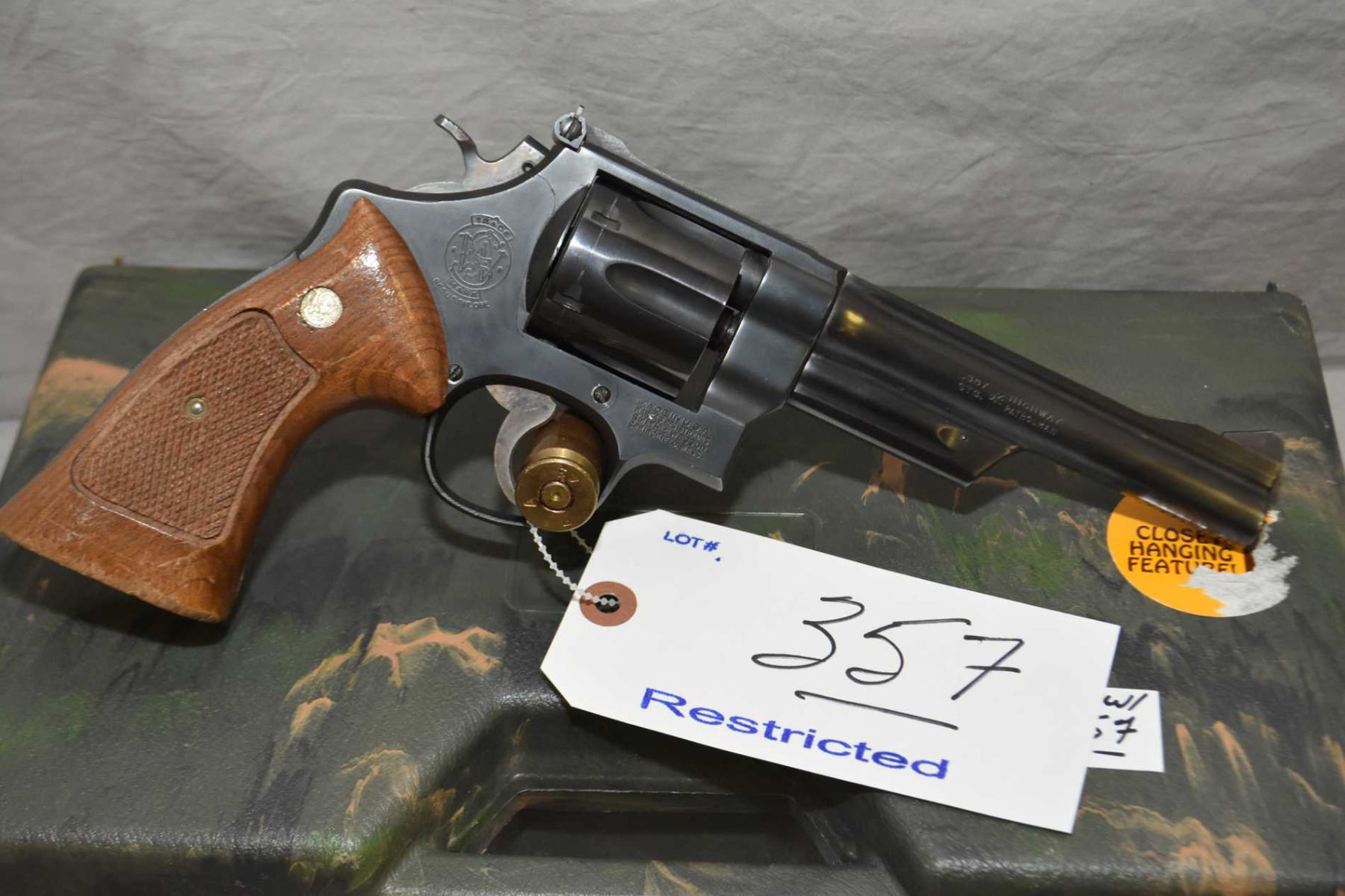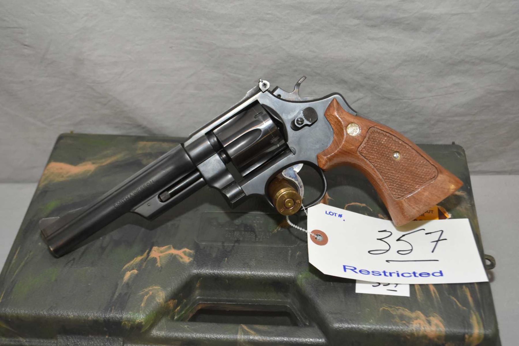 Smith & Wesson Model 28 - 2 Highway Patrolman .357 Mag Cal 6 Shot Revolver w/ 152 mm bbl [ blued finish, adjustable rear sight, case colored trigger and hammer, some marks to metal including cylinder ring, checkered walnut Smith & Wesson insignia grips, with foam lined green camo toned case ] Ser # N952537 Restricted Handgun Cert # 6536612 FRT # 21950 - 3