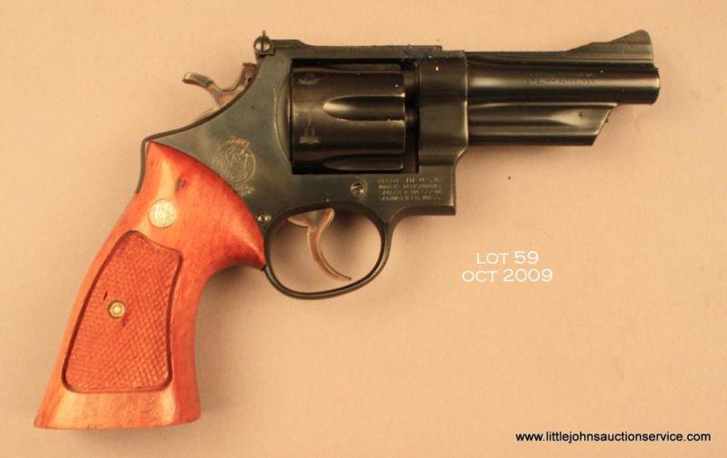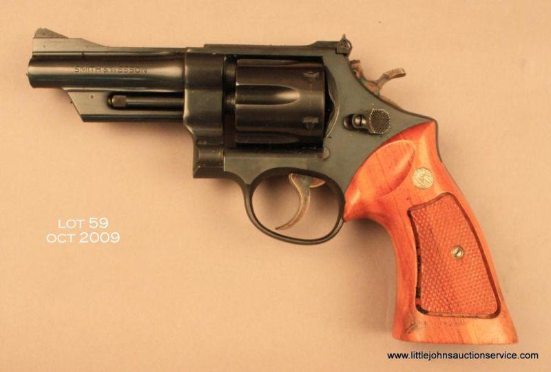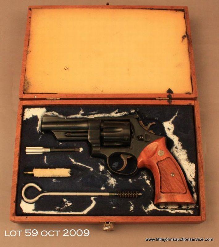 Smith & Wesson Model 28-2 Highway Patrolman DA revolver, .357 Magnum cal., 4” barrel, blue finish, checkered wood medallion combat grips, #N101748. This gun is in like new condition with a fine bore, crisp action, sharp markings, targethammer, very good grips with a slight loss on the lower right grip; accompanied by factory wood box with deteriorated blue lining (as is common with this vintage of display box). Est.: $300-$500.