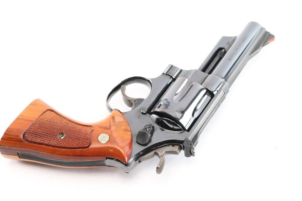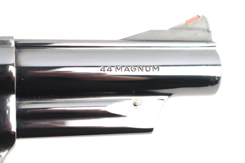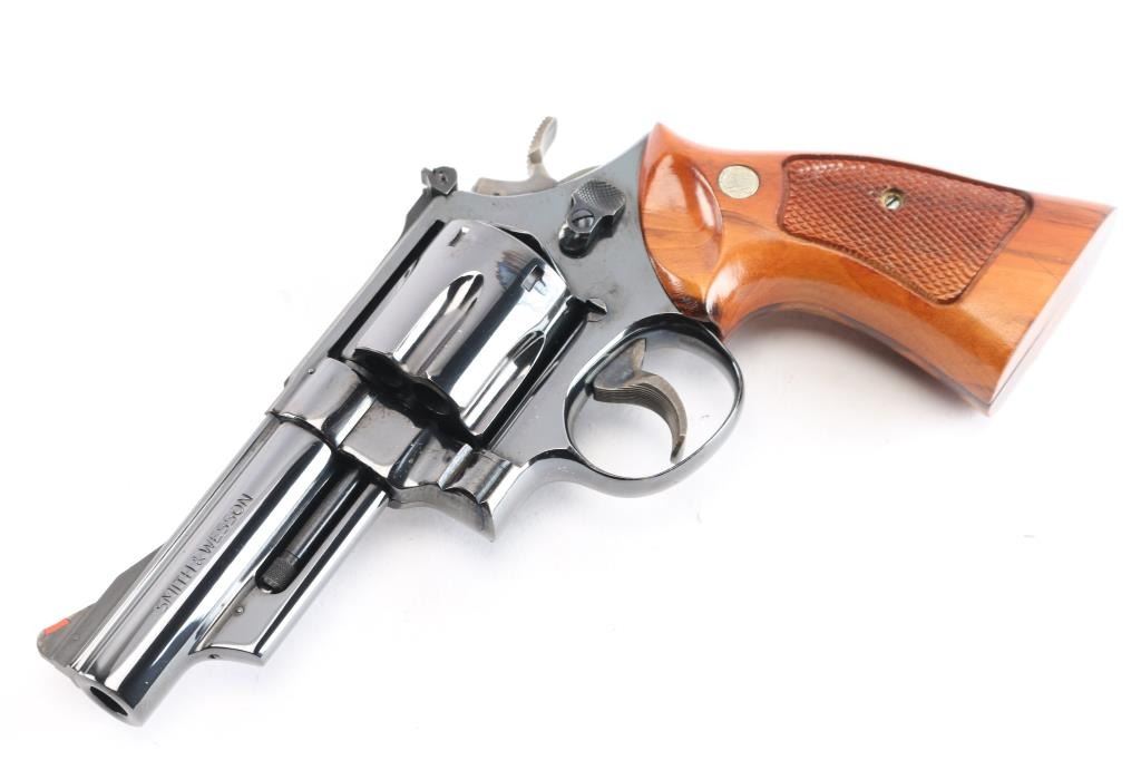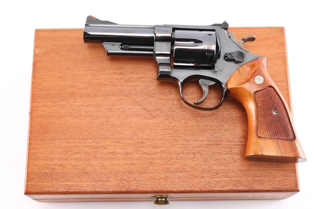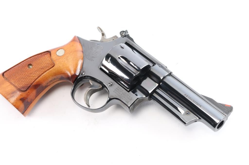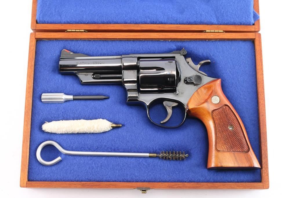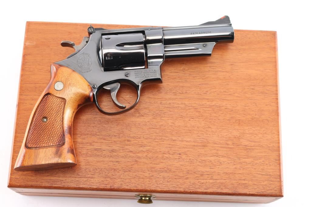 'The .44 Magnum' Large frame double action revolver chambered in .44 Magnum. Manufactured in Springfield, MA circa 1973. Features a polished blued finish, pinned 4" heavy barrel with partially serrated wide sighting rib, raised serrated ramp front sight with red insert, adjustable micrometer click rear sight with white outlined square notch, fluted six-shot cylinder with recessed chambers, shrouded ejector rod, case hardened serrated .500 target trigger, case hardened .500" target hammer, three screw square butt N target frame with ten-groove grip straps, and checkered Goncalo Alves target grips with silver S&W medallions. Includes a factory wood presentation case with blue felt lined fitted interior, screwdriver, and cleaning tools. Revolver retains approximately 95% of its original blued finish showing light handling marks, a faint drag line on the cylinder, and small scattered losses. The action is smooth with excellent lock-up, the bore is excellent/bright, and the wood grips are excellent.
