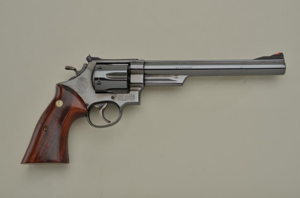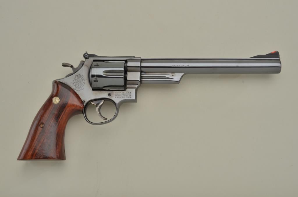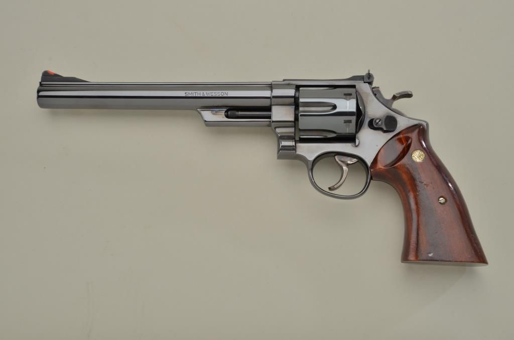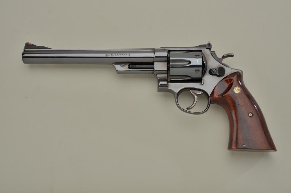 Smith & Wesson Model 29-2 DA revolver, .44 Magnum cal., 8-3/8” barrel, blue finish, smooth combat wood medallion grips, target hammer and trigger, red insert in front sight, #N329215 in like new condition showing little handling, fine inky blue original finish, drag line on cylinder and a couple mars to grips from storage. Est.: $750-$1,500.