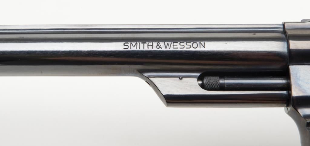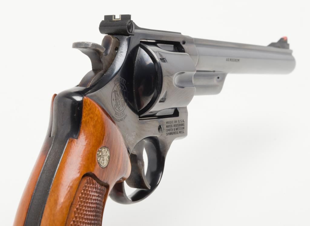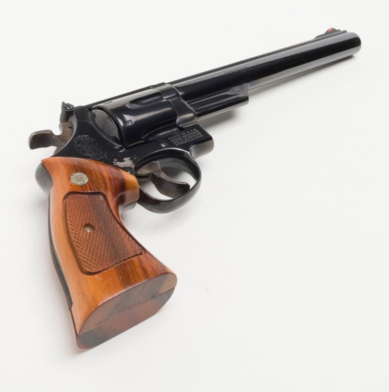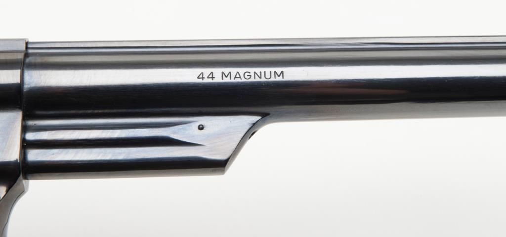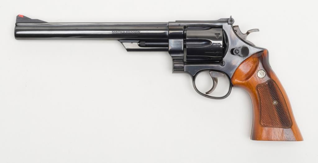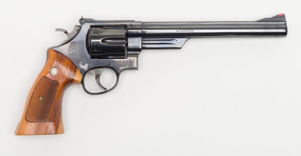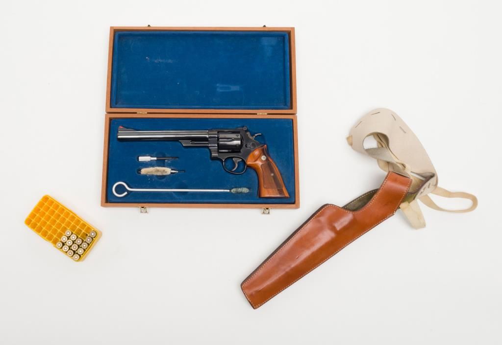 Smith & Wesson Model 29-2 revolver, cal. .44 Magnum, Serial #N647147. The pistol is in overall fine condition with an 8 3/8” blued barrel, with a red ramp front and adjustable rear sights . The finely checkered medallion grips are also infine condition showing little to no use. The pistol is cased in a S&W presentation box with cleaning rod, mop and screwdriver. The case is in overall fine condition as well. The bore is excellent, the action crisp and marking sharp onthis pistol. The lot includes a Safariland leather shoulder holster. For the guy looking for the Dirty Harry starter kit, this is the lot for you. (Modern/PPT). Est.: $400-$800.