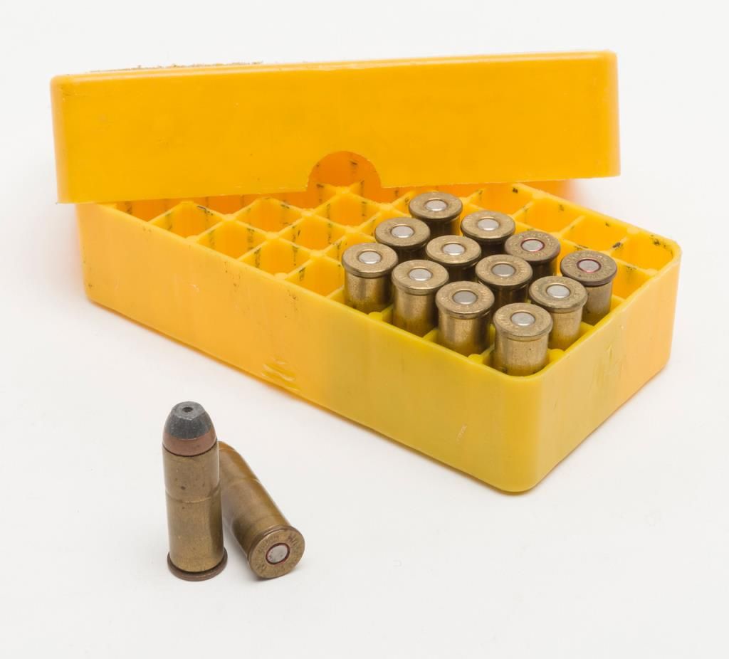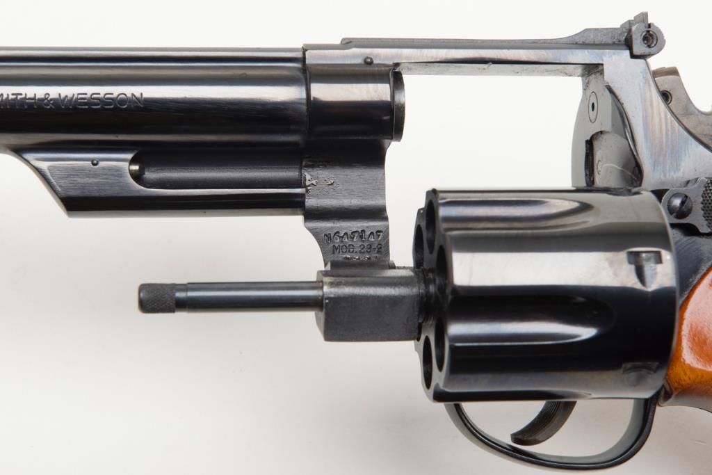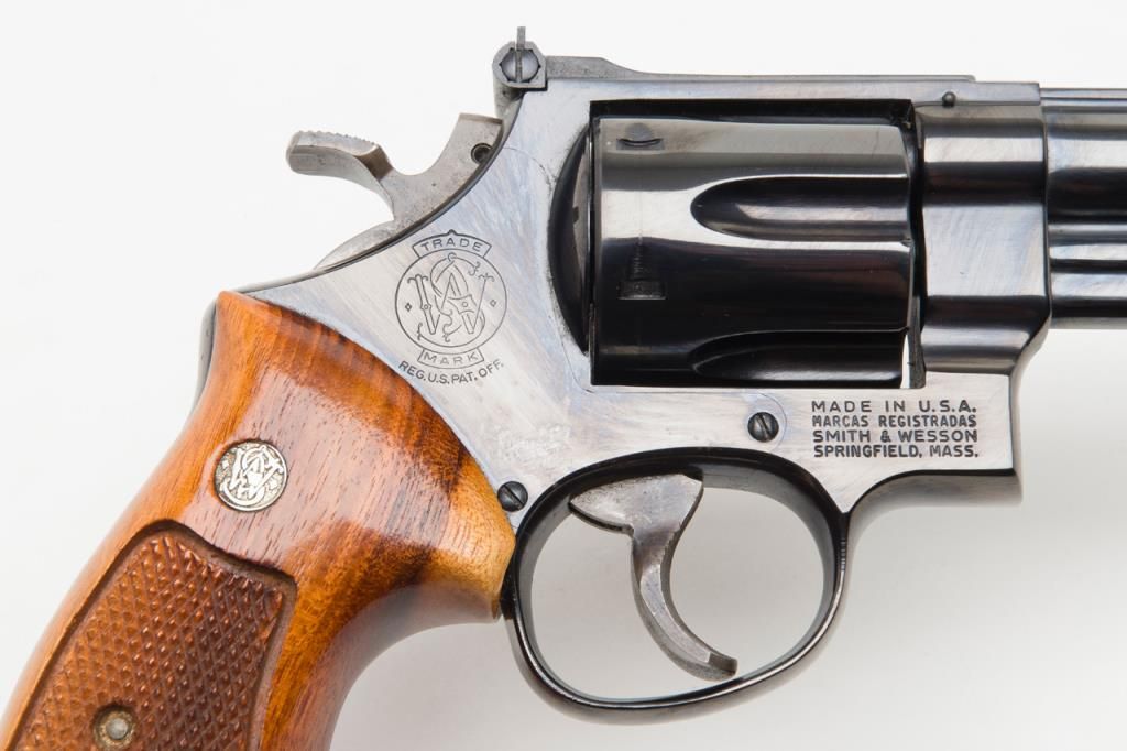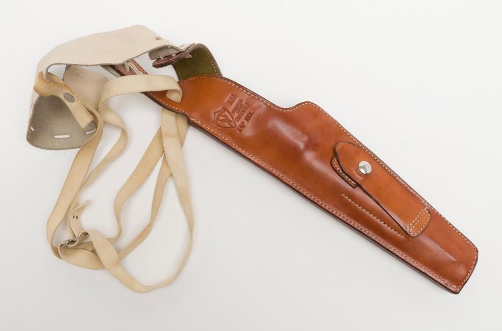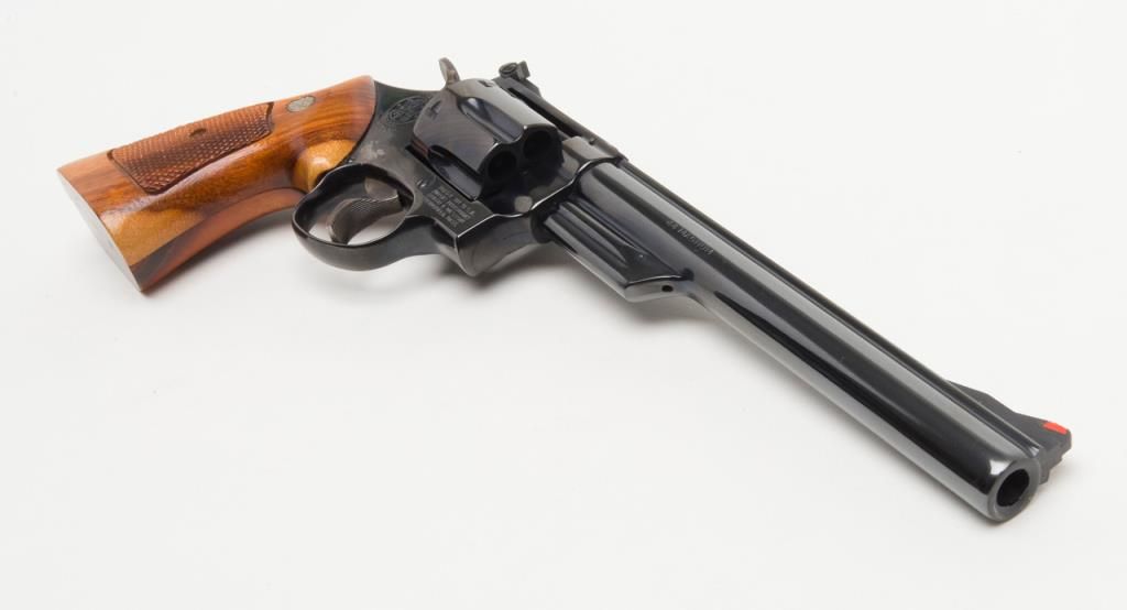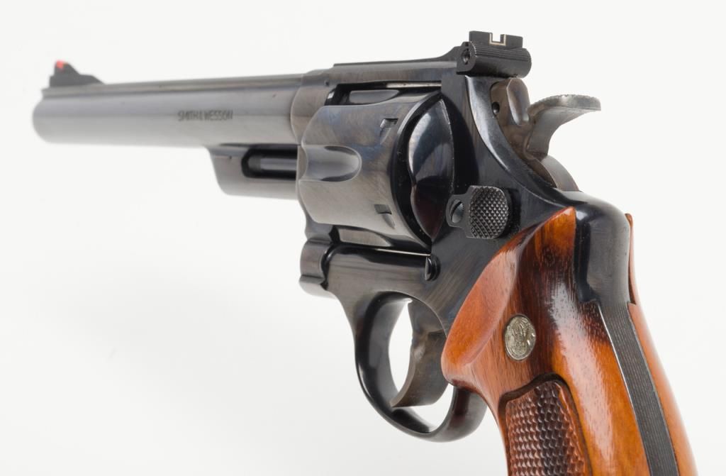 Smith & Wesson Model 29-2 revolver, cal. .44 Magnum, Serial #N647147. The pistol is in overall fine condition with an 8 3/8” blued barrel, with a red ramp front and adjustable rear sights . The finely checkered medallion grips are also infine condition showing little to no use. The pistol is cased in a S&W presentation box with cleaning rod, mop and screwdriver. The case is in overall fine condition as well. The bore is excellent, the action crisp and marking sharp onthis pistol. The lot includes a Safariland leather shoulder holster. For the guy looking for the Dirty Harry starter kit, this is the lot for you. (Modern/PPT). Est.: $400-$800.