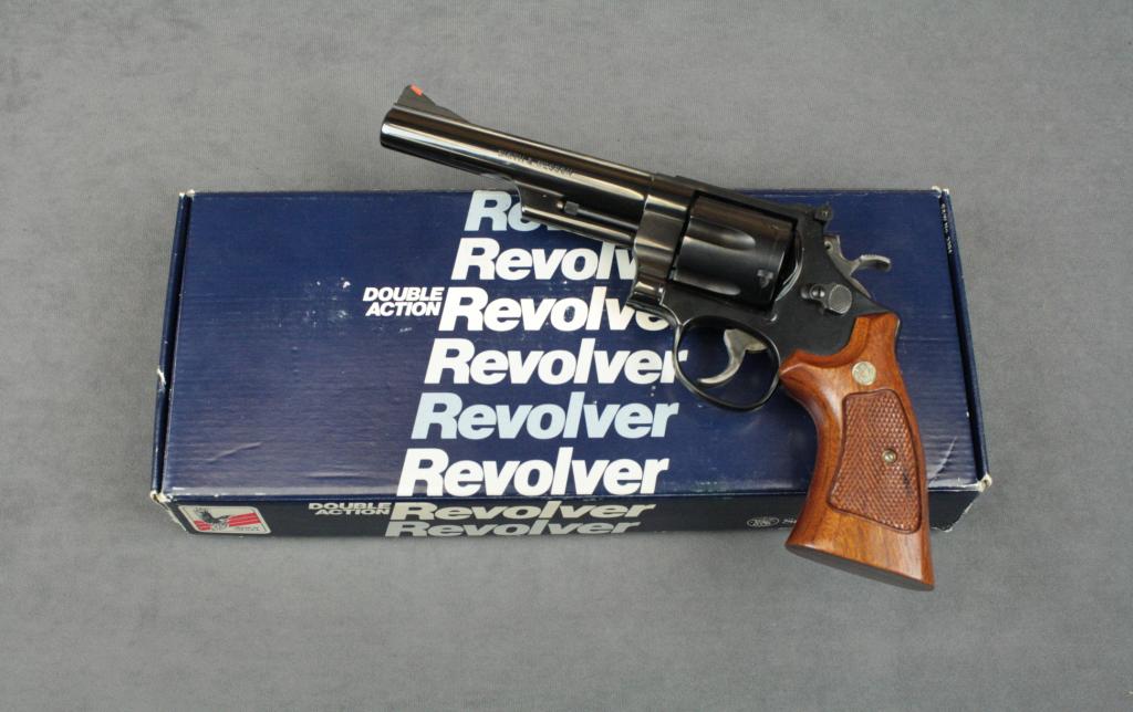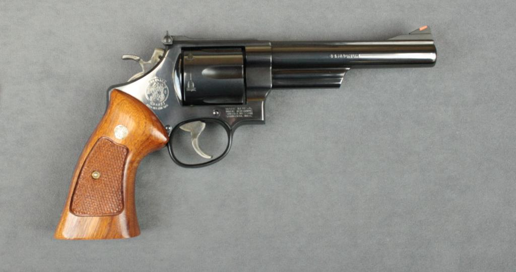 Smith & Wesson Model 29-3 DA revolver, .44 Magnum cal., 6” barrel, black finish, target hammer and trigger, adjustable rear sight with red insert front sight, checkered medallion combat wood grips, #AZF8770. Thisgun is in overall excellent like new condition showing little handling, approx. 99% + original finish, fine bore, action, markings and grips; accompanied by a S&W factory blue box with end label numbered tothis gun; be the Dirty Harry of your neighborhood. Est.: $400-$800.