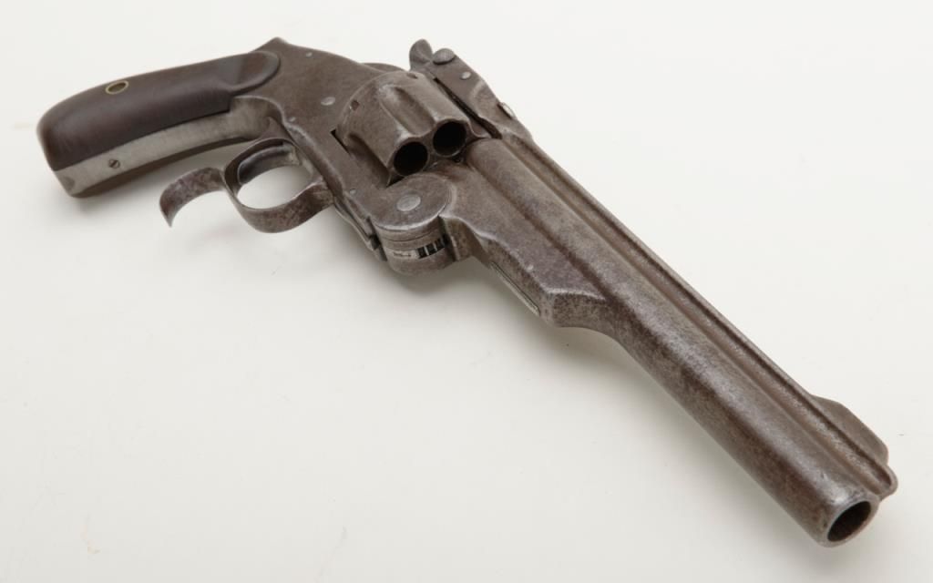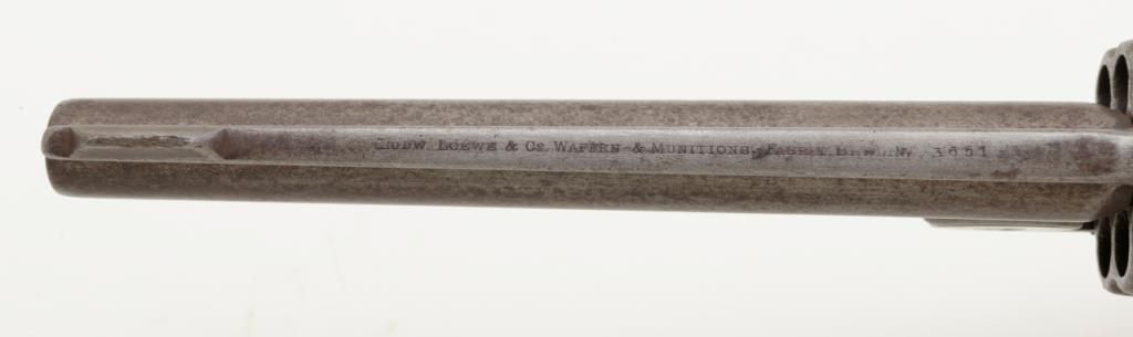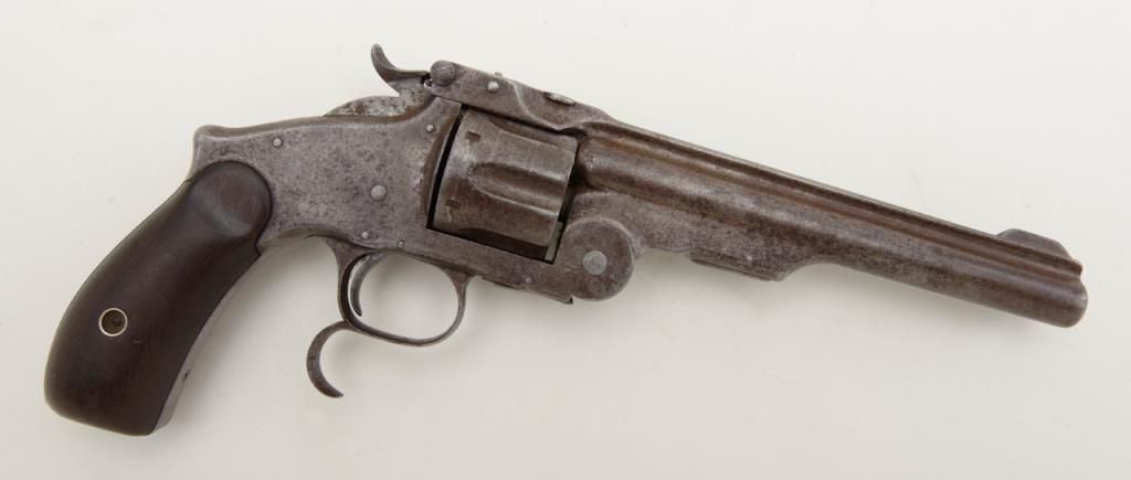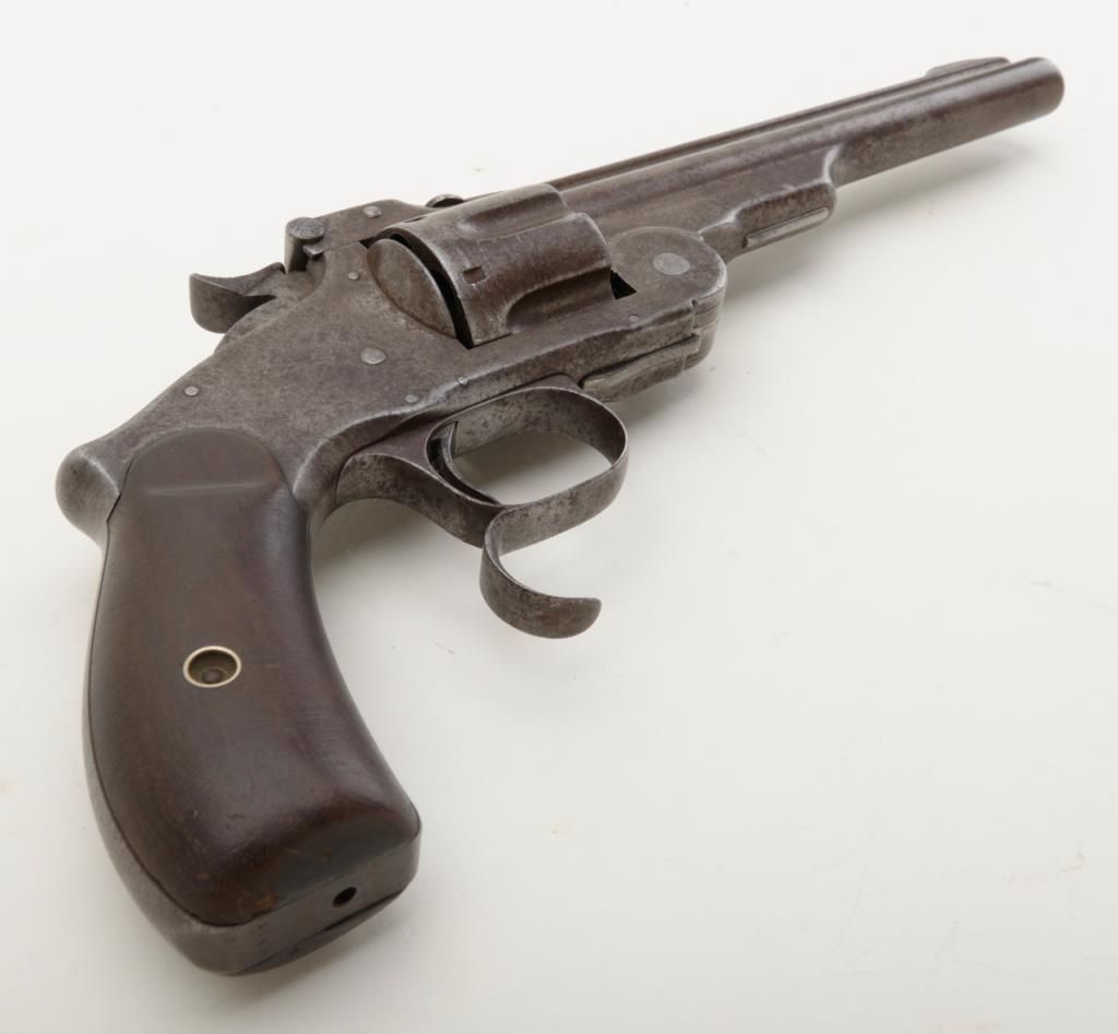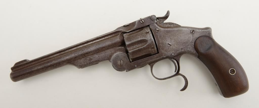 Smith & Wesson Model 3 Russian Third Model Ludwig Loewe & Co., Berlin single action revolver, .44 S&W Russian cal., 6-1/2” barrel, blue finish, wood grips, #3651. Made for the Russian government under contract, this gun is in overall very good condition showing a brown patina on metal surfaces, good bore, crisp action, good markings and grips; lanyard ring is missing, front integral sight has been shortened long ago; a hard-to-find variation of this desirable large frame S&W. Est.: $900-$1,800.