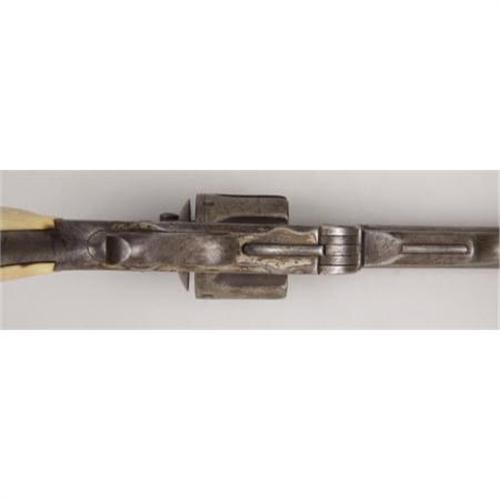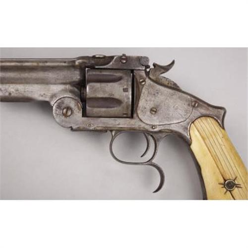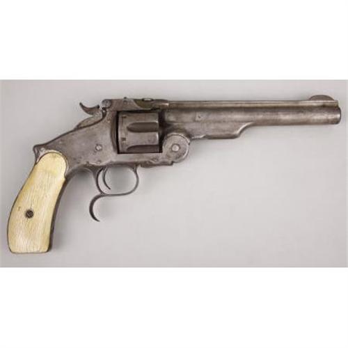 <B>SMITH AND WESSON MODEL 3 RUSSIAN THIRD MODEL</B></I> - Serial number 44250, circa 1870's. 6 ½” barrel in .44 S & W Russian calibre. All features as standard for this commercial model including single line barrel address terminating in “Russian Model”. Mechanically functional with two piece ivory grips. 1874 inside rectangular panel stamped on butt above serial number.<BR><BR><B>Condition:</B></I>Faintest trace of original finish remains. Entire metal surface of revolver heavily cleaned leaving a light grey overall appearance with some staining. Moderately deep pitting scattered over metal surfaces. Old ivory grips have good old patina. Left grip has a large replaced segment that has aged well with the remaining portion of the grip.<BR><BR><b>Shipping:</b> Bats, Clubs, Sticks, Swords, Rif (<a target="_blank" href="http://www.heritageauctions.com/common/shipping.php">view shipping information</a>)