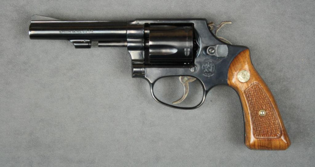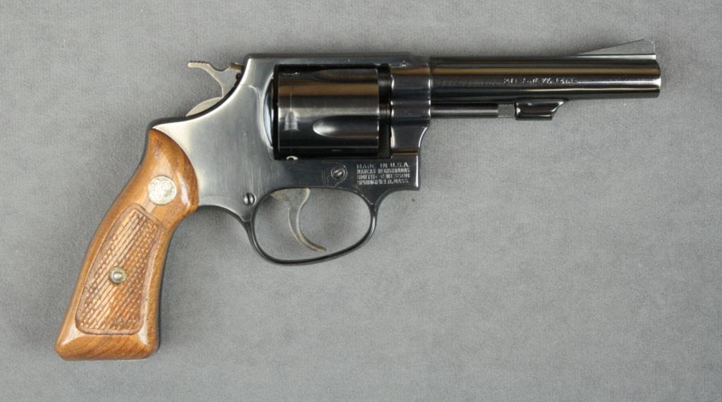 Smith & Wesson Model 33-1 DA revolver in factory box numbered to this gun with instructions; .38 S&W cal., 4” barrel, blue finish, checkered wood medallion grips, #107712. This gun is in excellent conditionshowing little use or handling with factory instructions sheet. Est.: $300-$600.