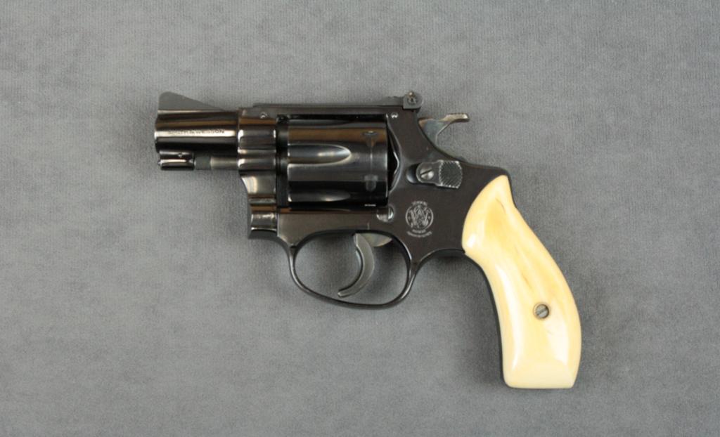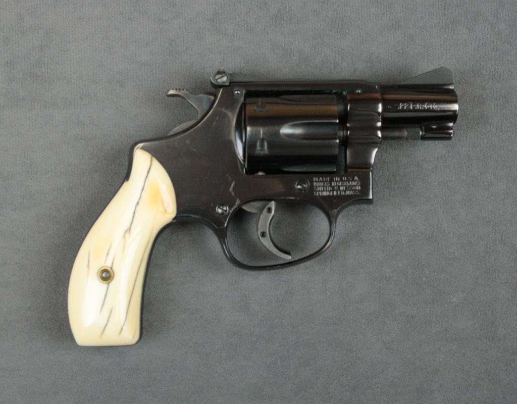 Smith & Wesson Model 34-1 DA revolver, .22LR cal., 2” barrel, blue finish, adjustable rear sight, trigger shoe, ivory grips, #131476. This gun is in overall excellent condition showing approx. 98% original blue with finebore, action, markings and smooth ivory grips. Est.: $500-$800.