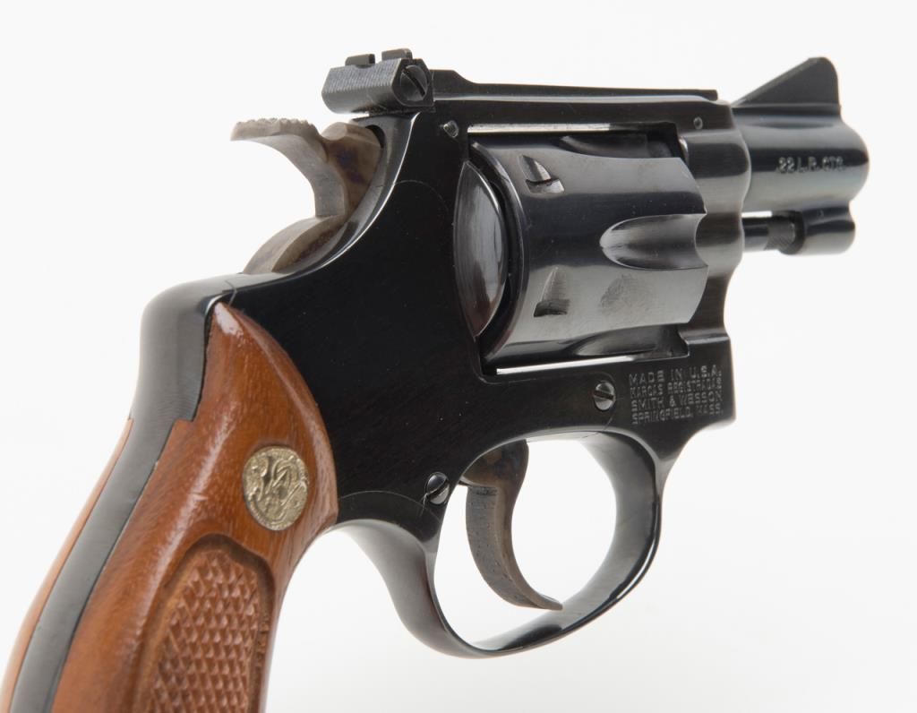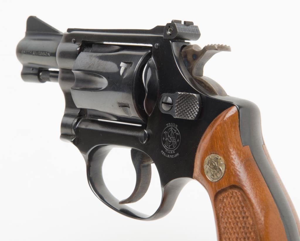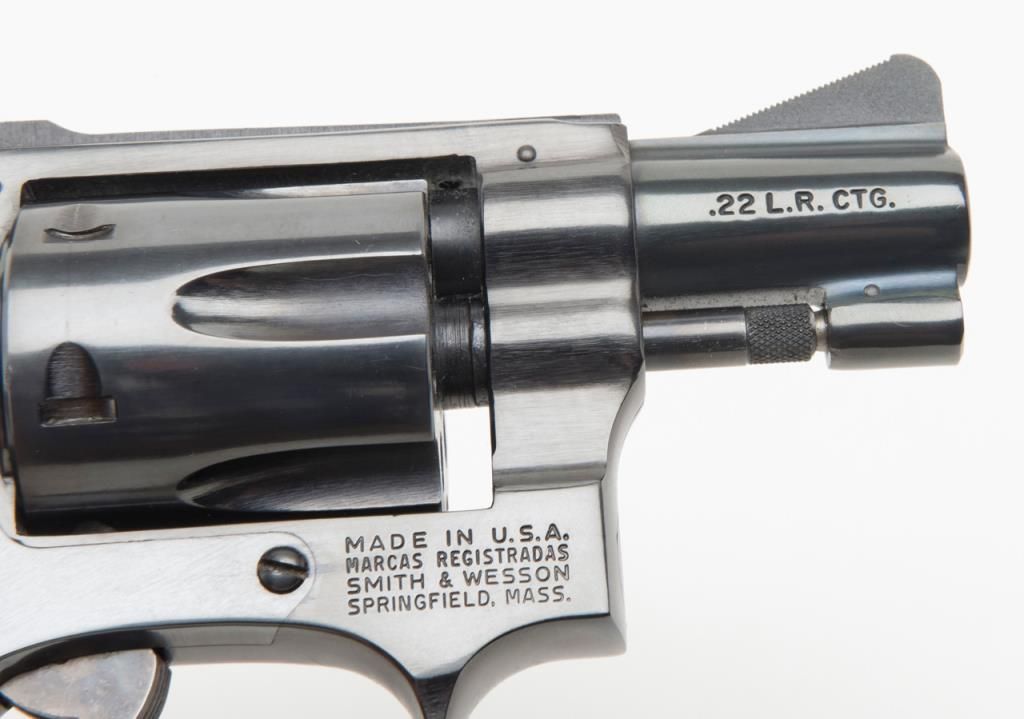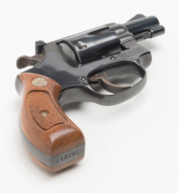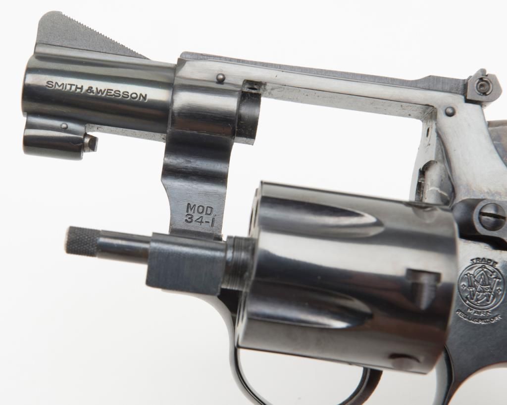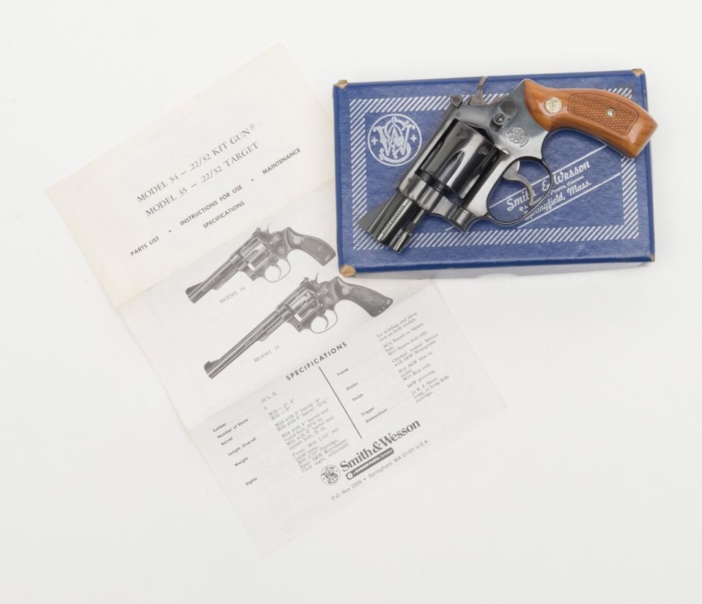 Smith & Wesson Model 34-1 DA revolver, .22LR cal., 2” barrel, blue finish, checkered wood medallion grips, #M180807 in like new condition showing little use, fine bore, action, markings and grips with two-piece factory blue cardboard boxdisplaying end label numbered to this gun; instructions sheet included. (Modern/PPT). Est.: $250-$500.