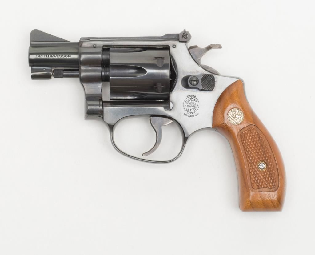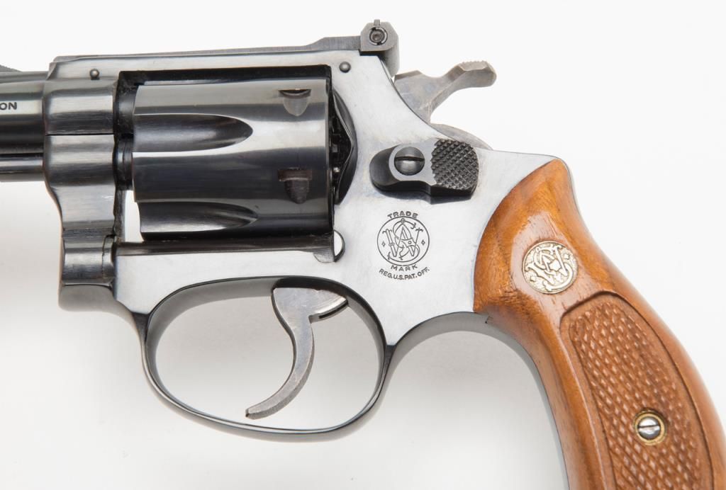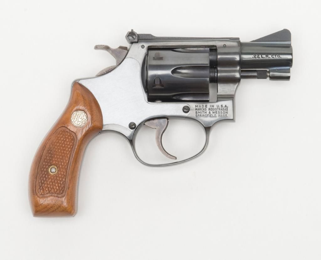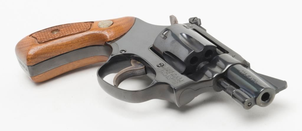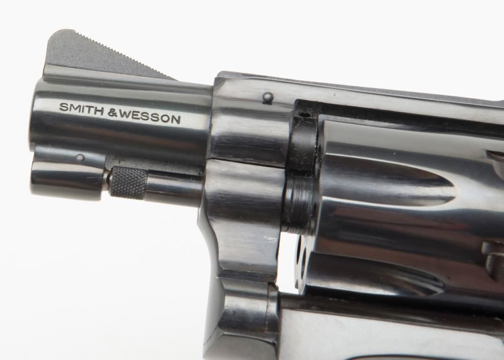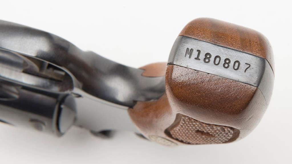 Smith & Wesson Model 34-1 DA revolver, .22LR cal., 2” barrel, blue finish, checkered wood medallion grips, #M180807 in like new condition showing little use, fine bore, action, markings and grips with two-piece factory blue cardboard boxdisplaying end label numbered to this gun; instructions sheet included. (Modern/PPT). Est.: $250-$500.