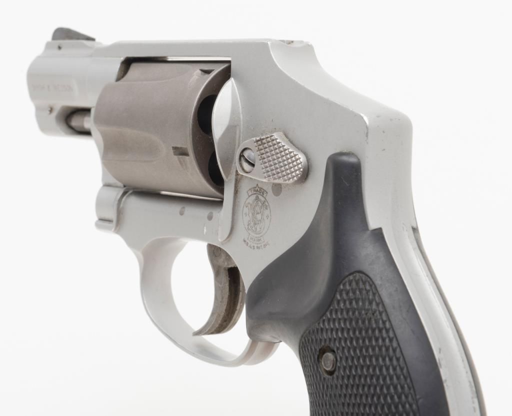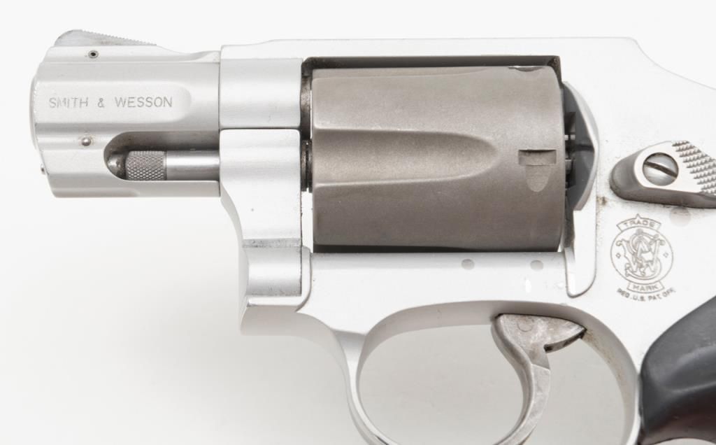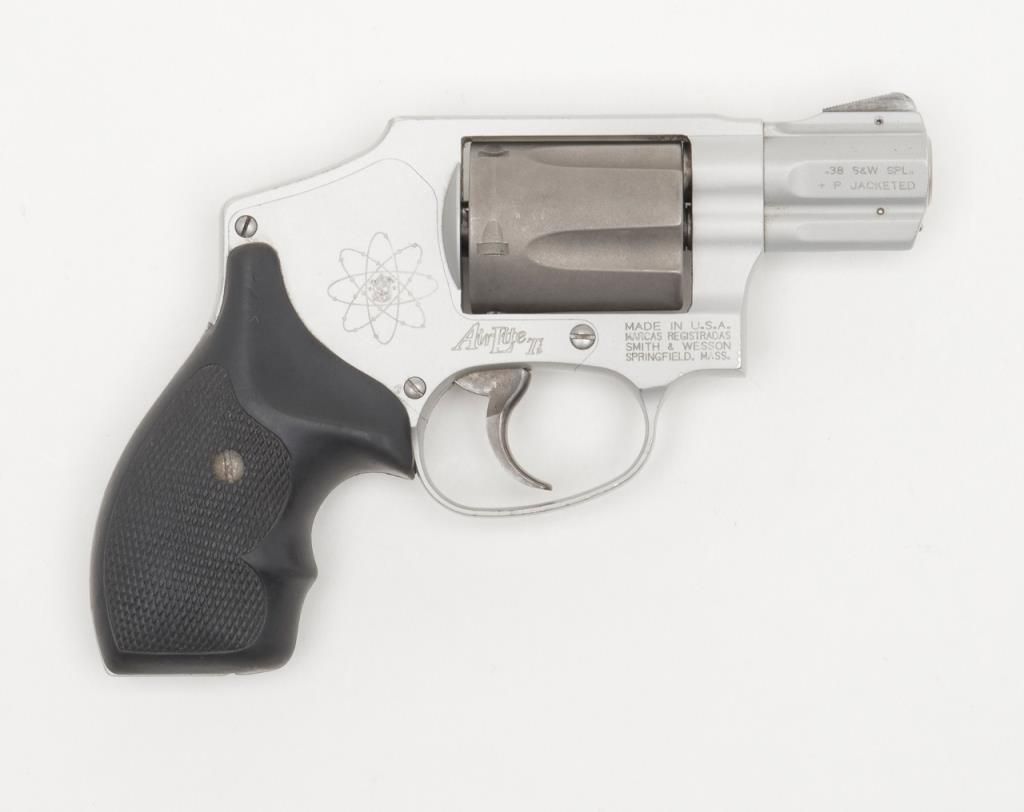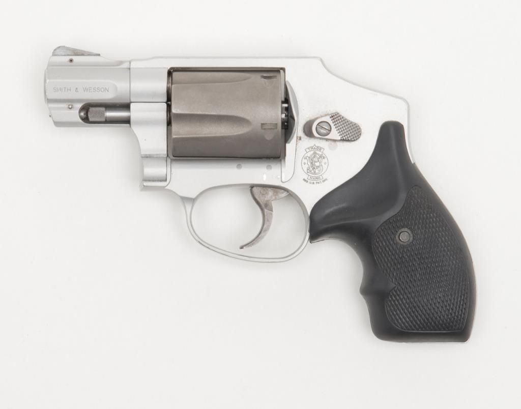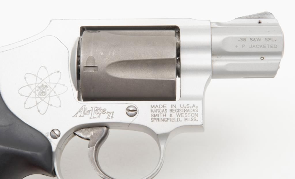 Smith & Wesson Model 342 Air Lite Ti DA only hammerless revolver, .38 Special + P cal., 1-7/8” barrel, Scandium alloy frame, mat finish, checkered hard rubber finger groove grips, #CEA5424 in overall fine condition with a finebore, crisp action, sharp markings and fine grips. (Modern/PPT). Est.: $350-$700.