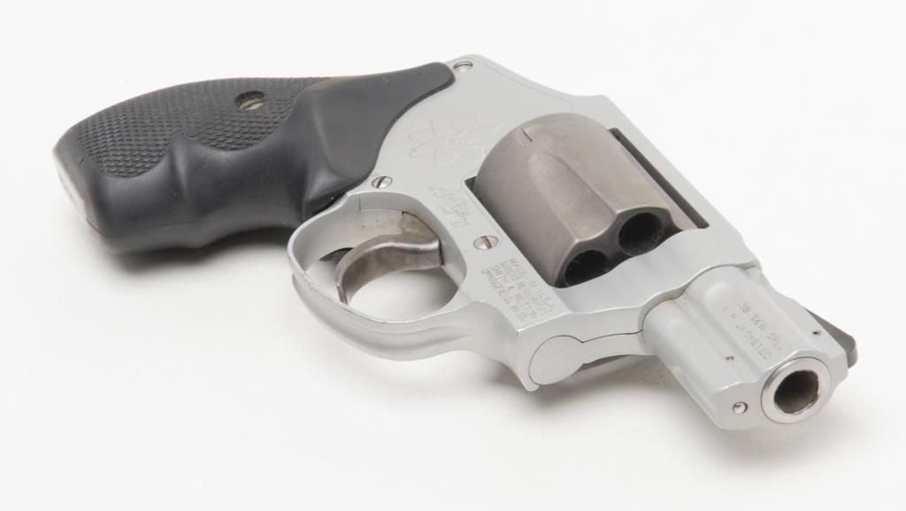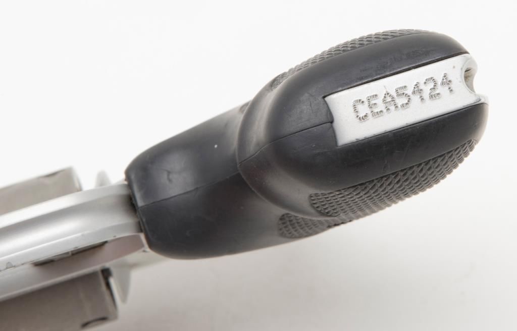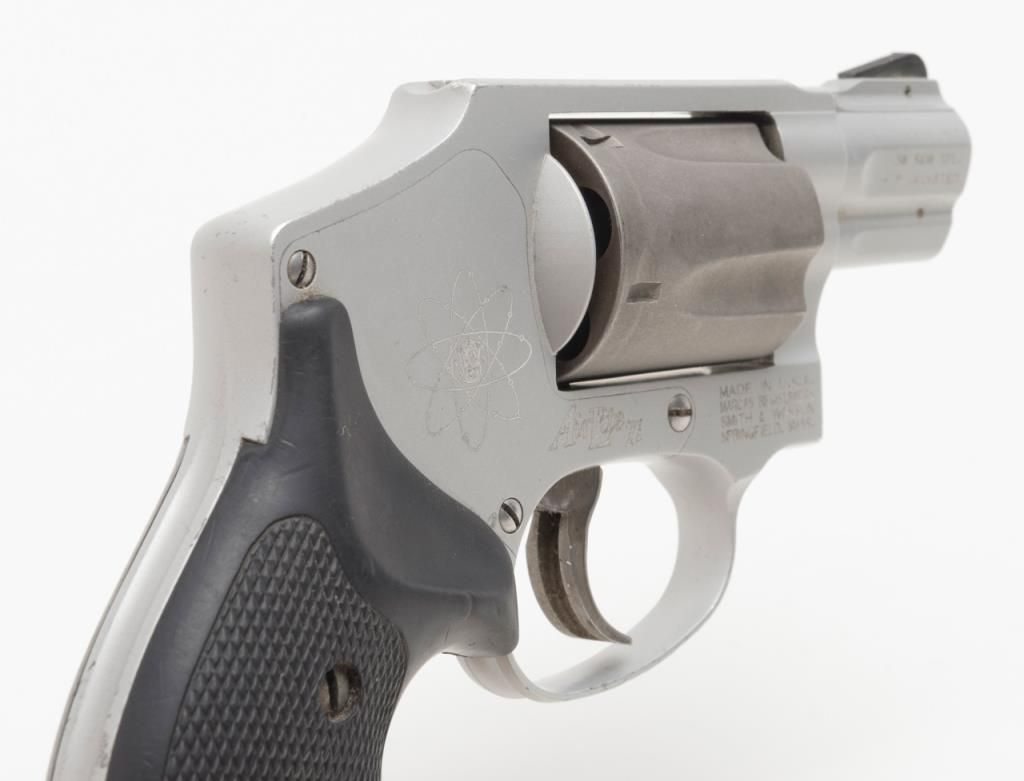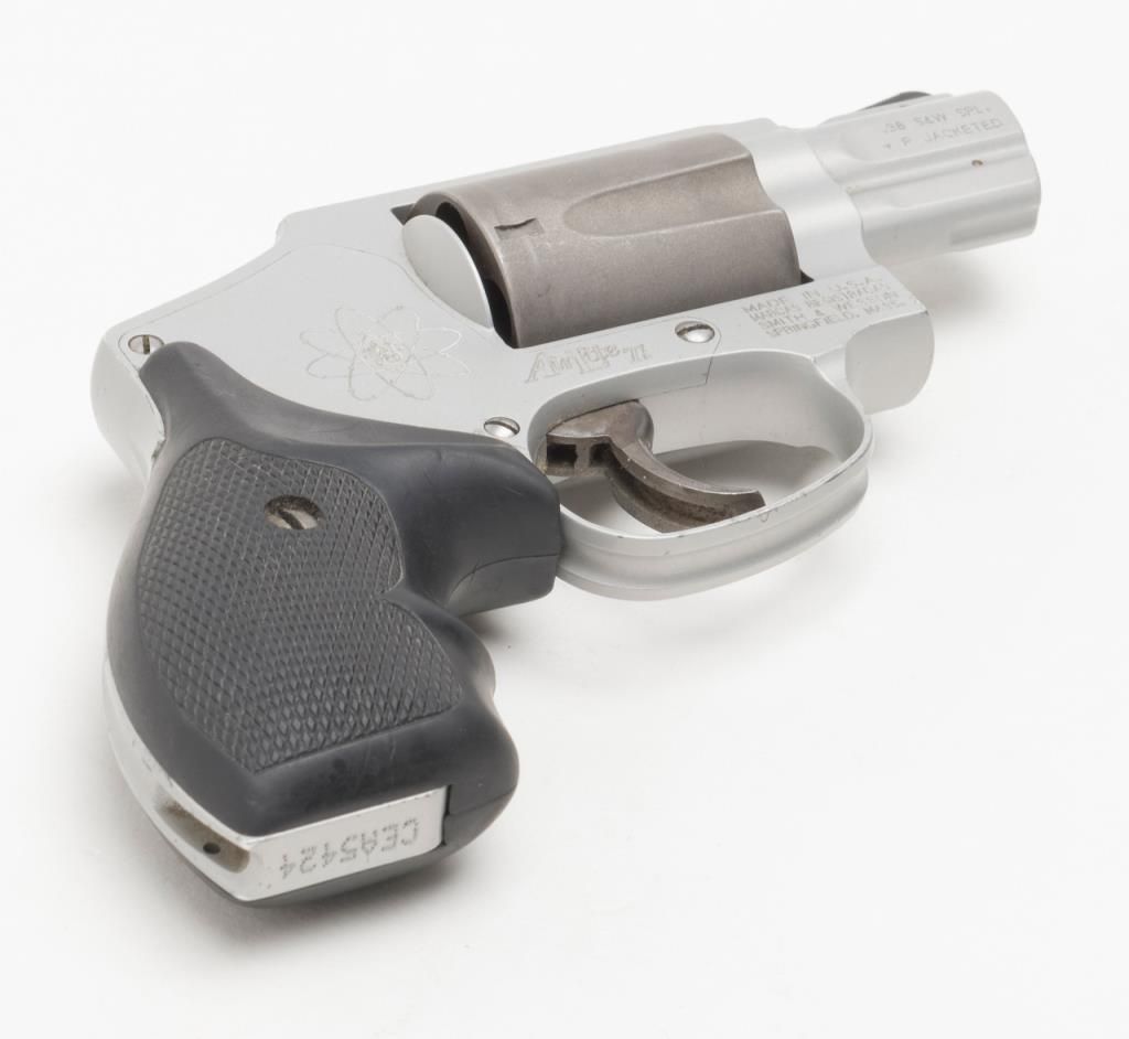 Smith & Wesson Model 342 Air Lite Ti DA only hammerless revolver, .38 Special + P cal., 1-7/8” barrel, Scandium alloy frame, mat finish, checkered hard rubber finger groove grips, #CEA5424 in overall fine condition with a finebore, crisp action, sharp markings and fine grips. (Modern/PPT). Est.: $350-$700.