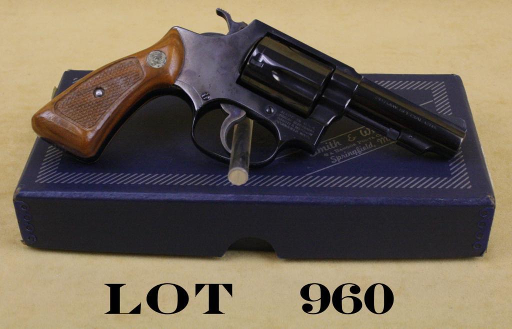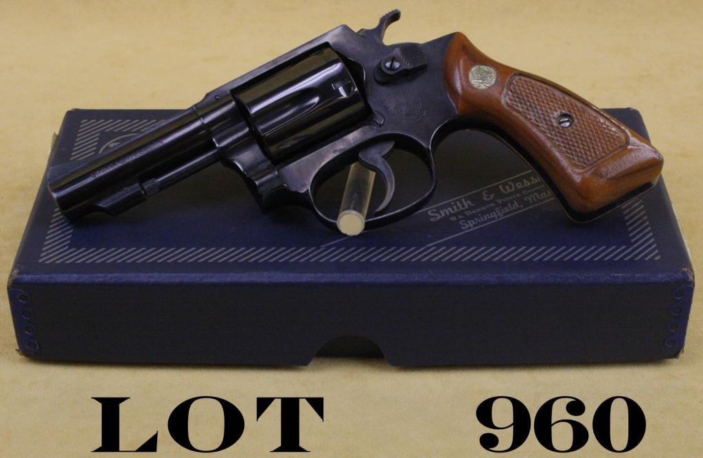 Smith & Wesson Model 36-1 DA revolver, .38 Special cal., desirable 3” pinned barrel, blue finish, checkered medallion wood grips, in correct factory box numbered to this gun, #J713861. This gun is in overall finecondition showing little handling; a couple of light spots of erosion that may clean; the factory grease in the crane has somewhat dried and makes the swing out cylinder sluggish; some simple oiling will correctthis; slight drag line on cylinder. An exceptional condition scarce 3” “Chief’s Special”. Est.: $300-$600.