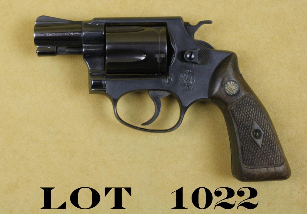 Smith & Wesson Model 36 (no dash) DA revolver, .38 Special cal., 2” barrel, old quality re-blue finish, checkered medallion wood grips, #446746. This gun is in overall good condition showing approx. 98% oldre-blue finish, good bore, action and markings; overall good grips with some wear and dings; one of the most popular small “J” frame revolvers made by Smith & Wesson. Est.: $200-$400.