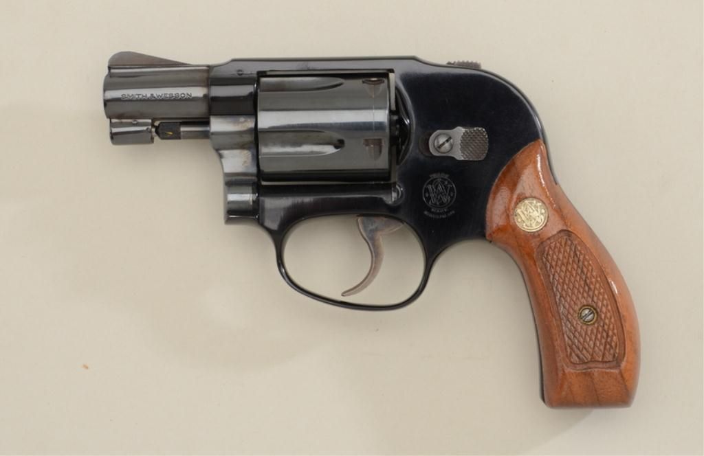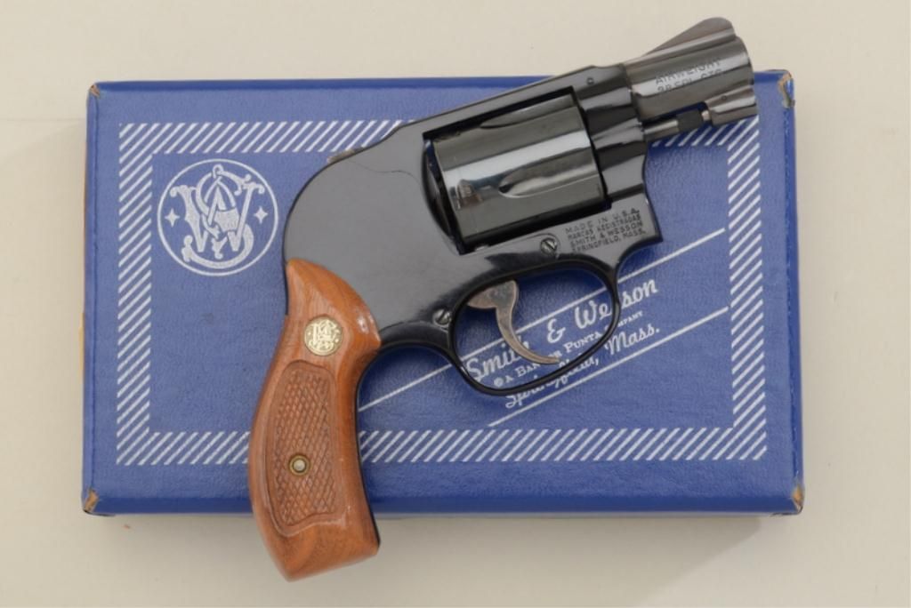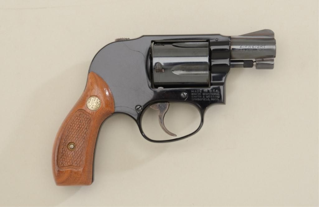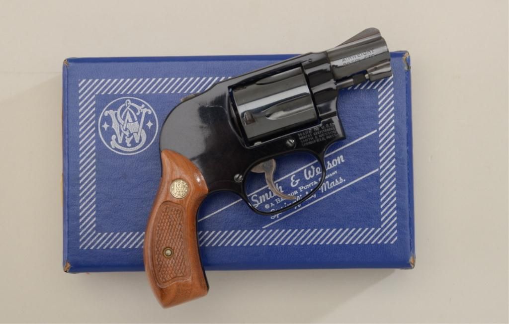 Smith & Wesson Model 38 (no dash) DA airweight revolver, .38 Special cal., 2” barrel, shrouded hammer, blue finish, checkered wood medallion grips, #J842106 with factory two piece blue box with correct endlabel and with factory instructions. This gun is in overall like new condition showing little handling; box is in overall very good condition. Est.: $300-$600.