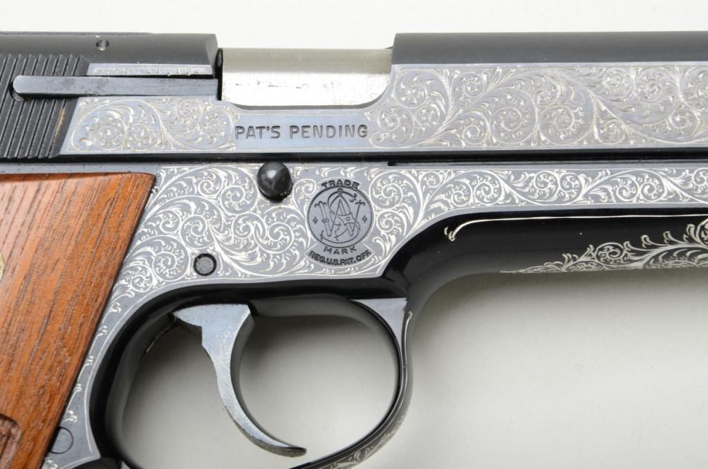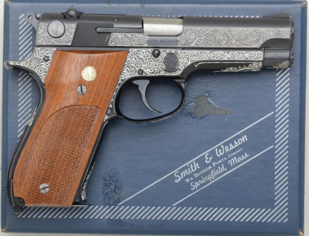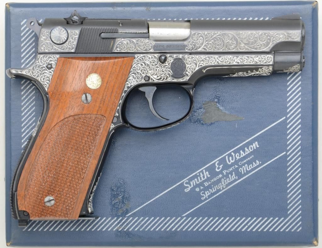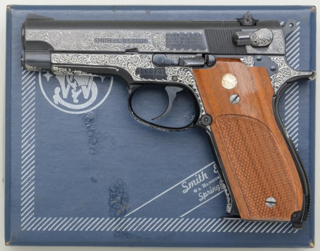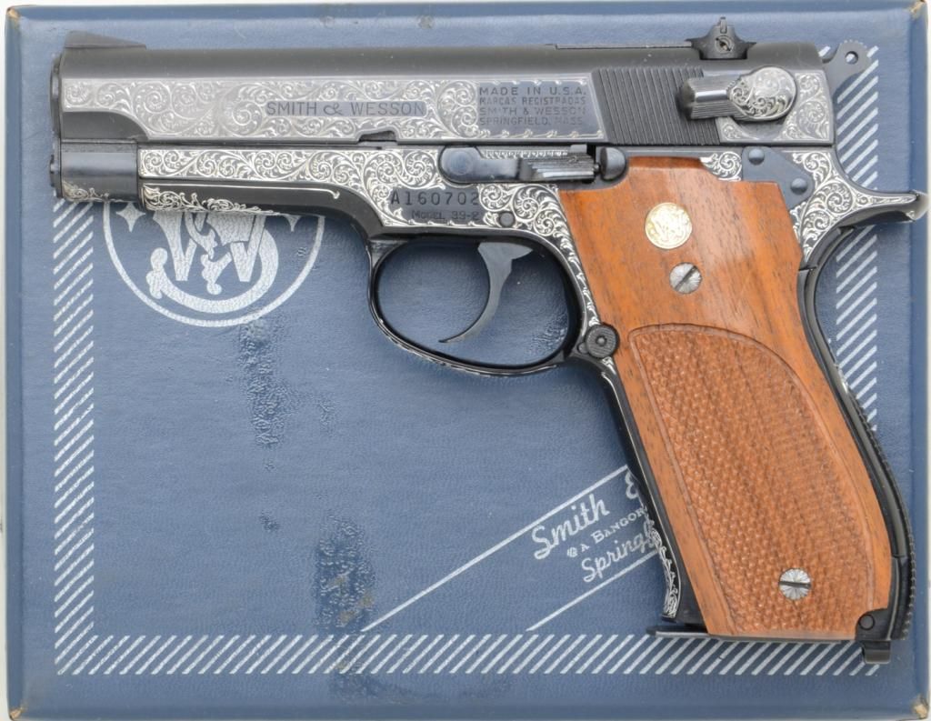Smith & Wesson Model 39-2 DA semi-auto pistol, non-factory engraved, 9mm cal., 4” barrel, blue finish, checkered wood medallion grips, #A160702. This gun is in overall fine condition showing extensive after-marketscroll engraving thru the original finish; majority of original finish remaining, fine bore, action, markings and grips; accompanied by a two-piece factory blue and silver cardboard shipping box with end labelmatching this gun; factory instructions, cleaning rod and extra magazine. CONSECUTIVE SERIAL NUMBER AND MATCHING ENGRAVING TO THE PREVIOUS LOT (771). Est.: $850-$1,250.