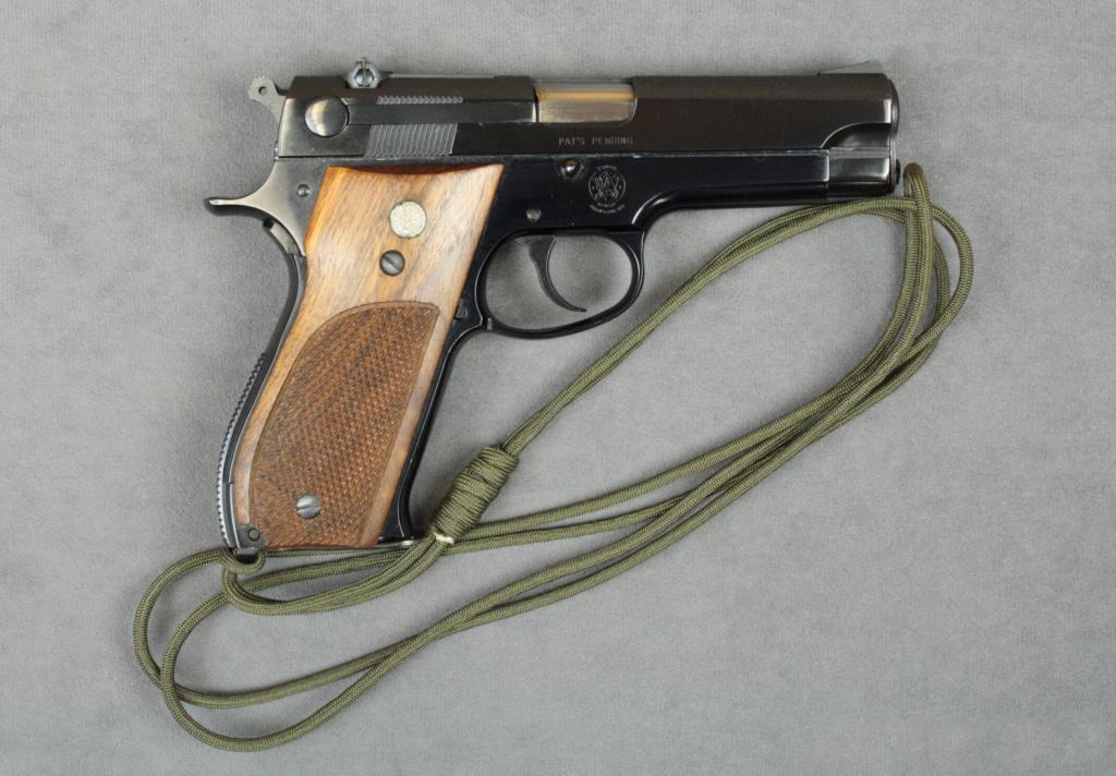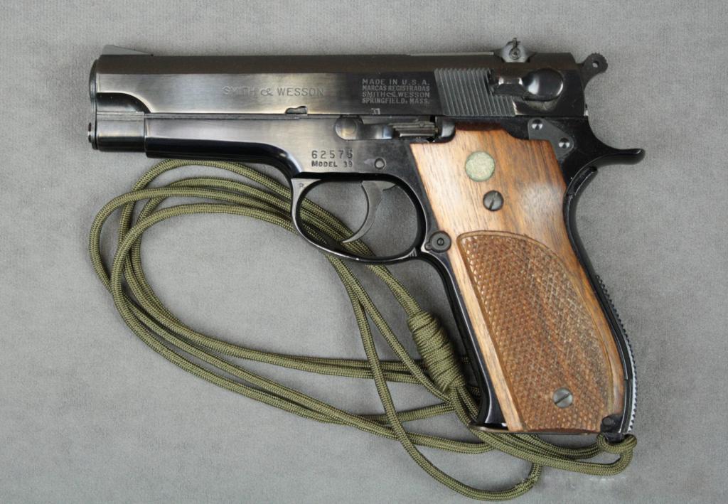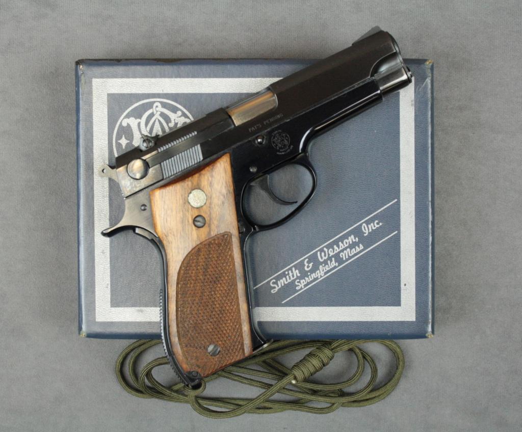 Smith & Wesson Model 39 DA semi-auto pistol, 9mm cal., 4” barrel, black finish, checkered medallion wood grips, #62575, with three extra magazines and the original blue factory box numbered to this gun. The pistol is inoverall excellent condition showing little use or handling; lanyard attached; box is overall fine. Est.: $350-$700.
