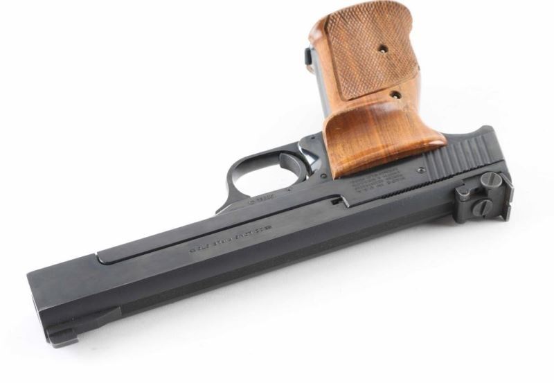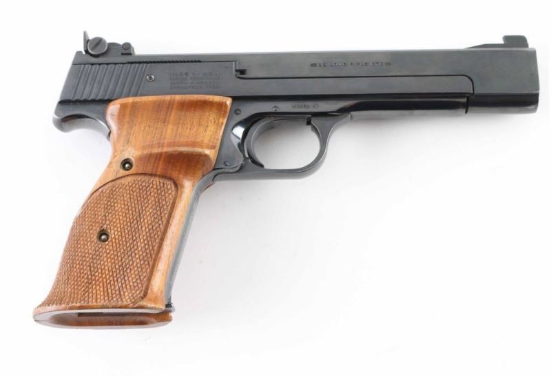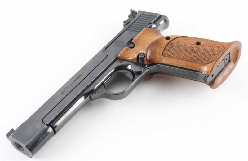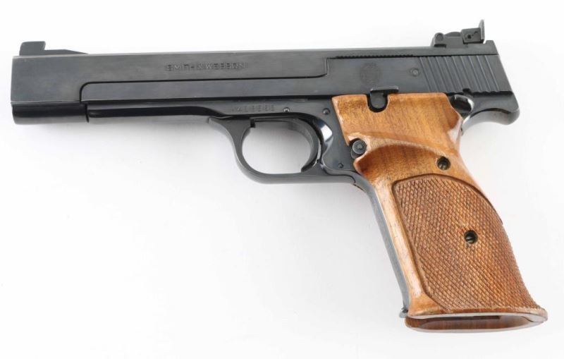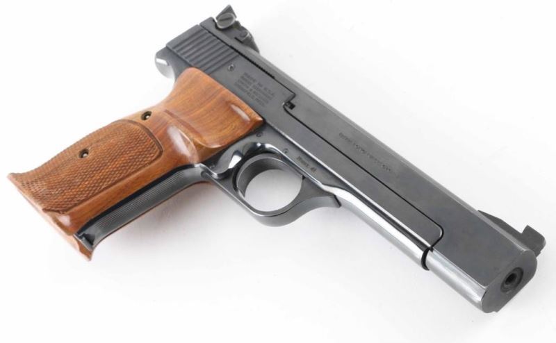 Pistol. Semi-Automatic. 10-rd magazine. Produced 1957-Present. 5.5" with front blade, and adjustable notch rear sights. Carbon steel frame, and steel slide. Concealed hammer. Wide grooved trigger. Action opens by locking back the slide and swinging down the triggerguard, allowing the barrel, and slide to be lifted off the frame. Bore appears very good, but a little dirty. Slide action is smooth/tight. Checkered walnut grips with modified thumb rest are good with some edge wear, and minor chips. Blued finish is about 98% with some very minor scratches. Comes with one 10-rd S&W magazine. NRA Condition-Very Good. Modern Firearm.