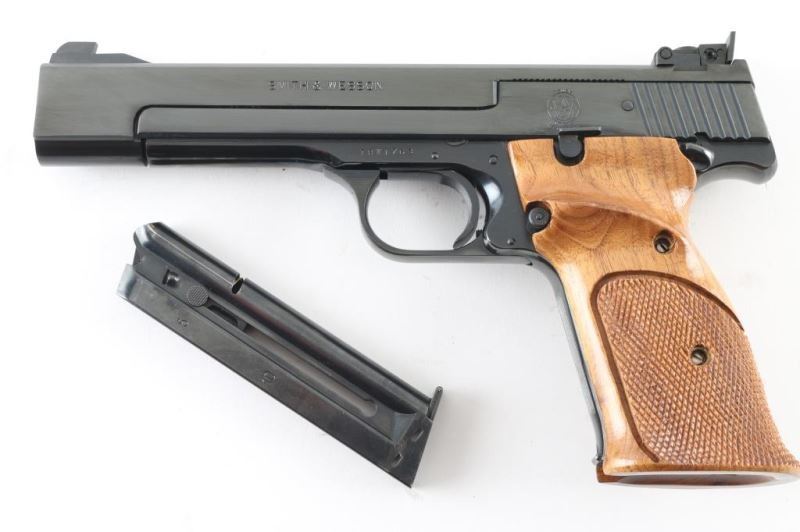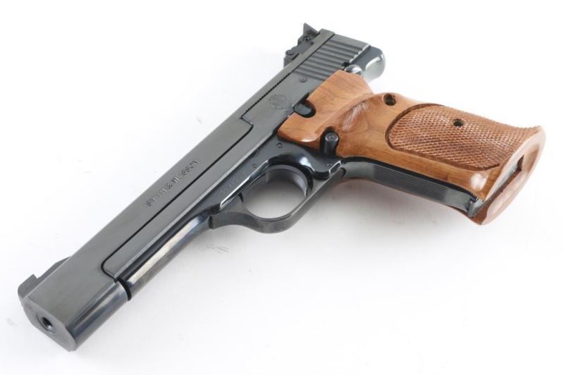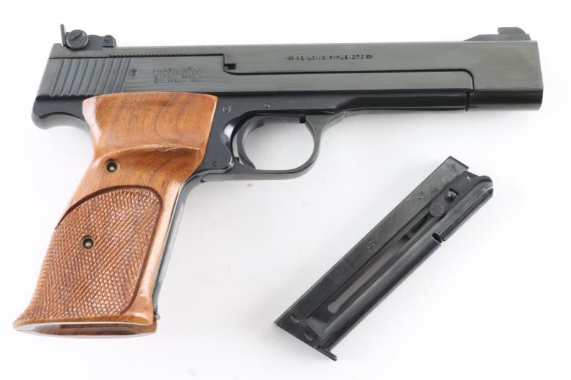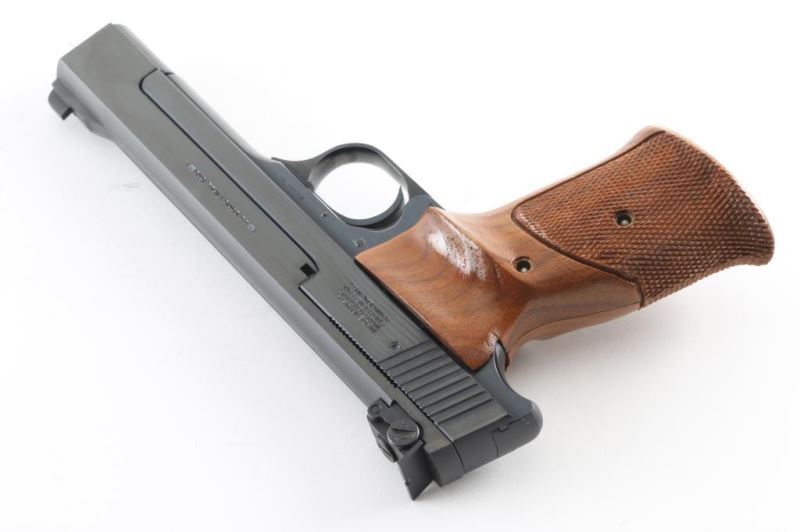 Semiautomatic rimfire target pistol features blued finish, checkered wood thumbrest target grips, 5.5" barrel, adjustable sights, pushbutton magazine release, manual safety. Bore is excellent. Retains 98% blue with light handling marks. Grips are excellent with few small dents. Includes (2) magazines. Condition is NRA Excellent - like new *** Modern Firearm ***