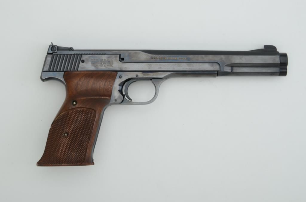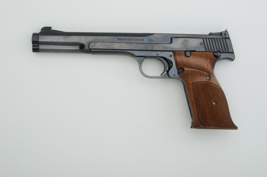 Smith & Wesson Model 41 semi-auto target pistol, .22LR cal., 7-1/2” barrel, blue finish, checkered wood thumb rest target grips, #71558, in factory two piece cardboard box with instructions, end label numbered to this gun, extra magazine, barrel weight, extra barrel extension and extra 5” barrel assembly. This gun is in overall fine condition showing the majority of its original finish with fine bore, action,markings and grips; extra barrel also has a fine bore, finish, markings and is in .22LR caliber. Lid of box shows damage from improper storage. Est.: $800-$1,600.