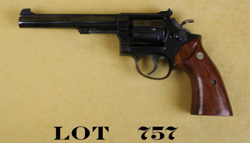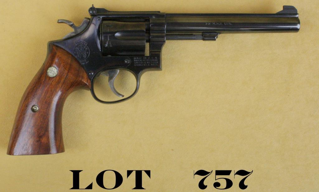Smith & Wesson Model 48-2 DA revolver, .22M.R.F. cal., 6” barrel, blue finish, smooth wood combat medallion grips, #K708037. This gun is in overall excellent condition showing approx. 97% original blue finish with some wear at the high points and muzzle, excellent bore, action, markings and overall very good grips with a couple sight scratches; target hammer and trigger showing plenty of case color. Est.: $250-$350.