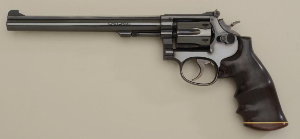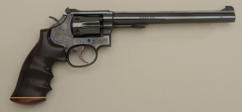 Smith & Wesson Model 48-4 DA revolver, .22 M.R.F. cal., 8-3/8” barrel, blue finish, custom wood finger groove grips, #29K7364 with factory blue two-piece cardboard box; end label numbered to this gun; in overallexcellent condition showing little handling; instructions and cleaning kit included; box is overall very good. Est.: $600-$1,200.