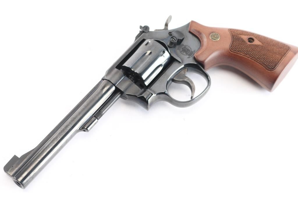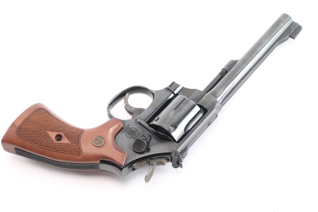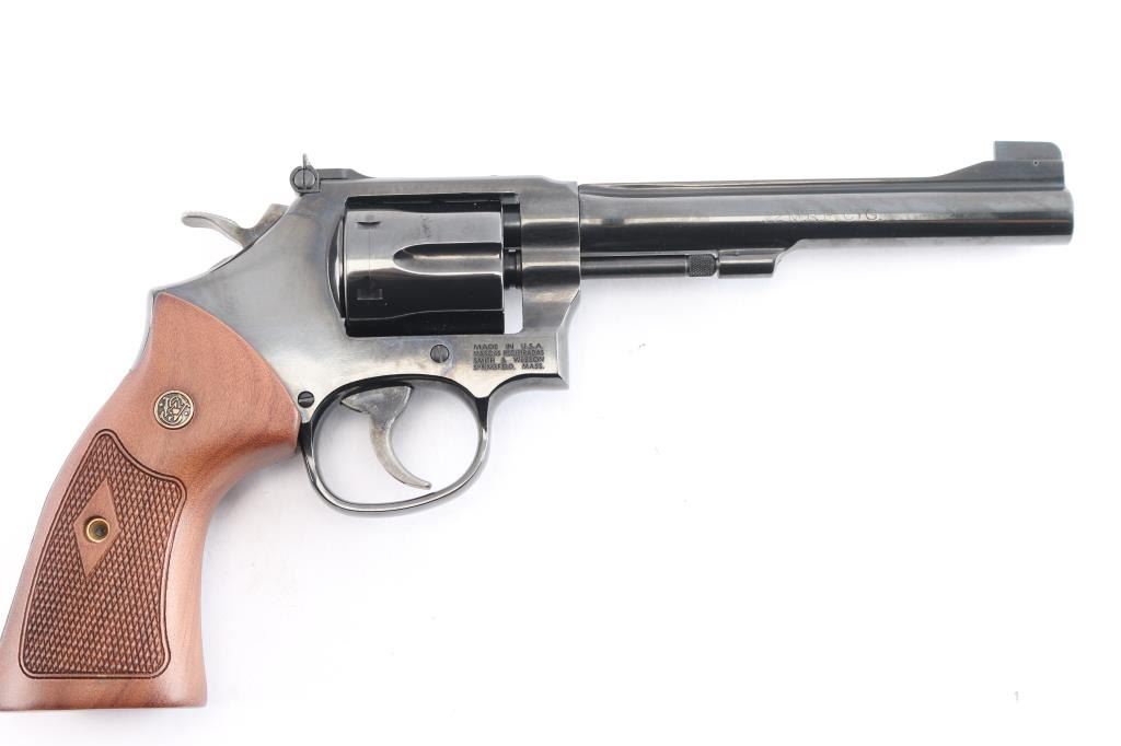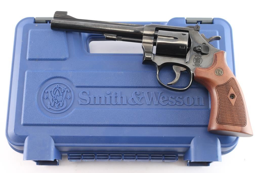 'The K-22 Masterpiece Magnum Rimfire,’ an American made medium frame double action revolver chambered in .22 Magnum, manufactured in Springfield, MA. This revolver has an alpha serial prefix and is not C&R eligible. Revolver features a blued finish, 6" serrated rib barrel with recessed crown, raised pinned partridge front sight, micrometer adjustable square notched rear sight, fluted six-round cylinder with counterbored chambers, checkered cylinder release, non-shrouded ejector rod, knurled ejector rod head, color-case hardened smooth curved trigger, color-case hardened target hammer with checkered spur, transfer bar safety, internal firing pin, three screw square butt 'K' target frame, internal locking system, ten groove grip straps, and two-piece diamond checkered walnut target grips with brass Smith & Wesson medallions. The original gloss blued finish retained is approximately 99% with a light drag line on the cylinder. Metal displays no rust or deformation. Action is smooth and crisp with a tight lock-up, and the wood grips are excellent. The bore is bright with strong rifling, and the cylinder chambers are excellent. Pistol includes the original foam lined factory hard case with documents, lock, and keys.