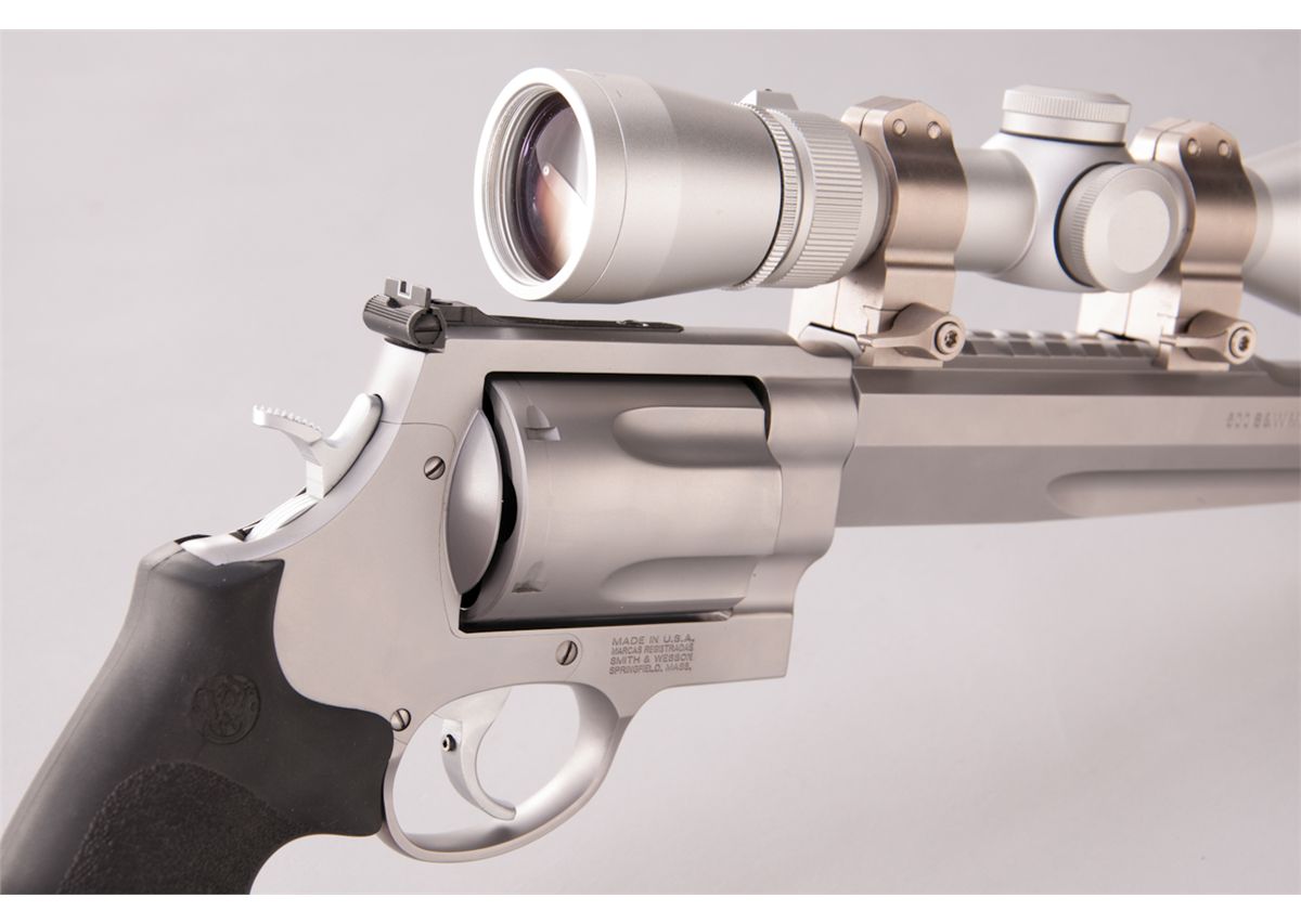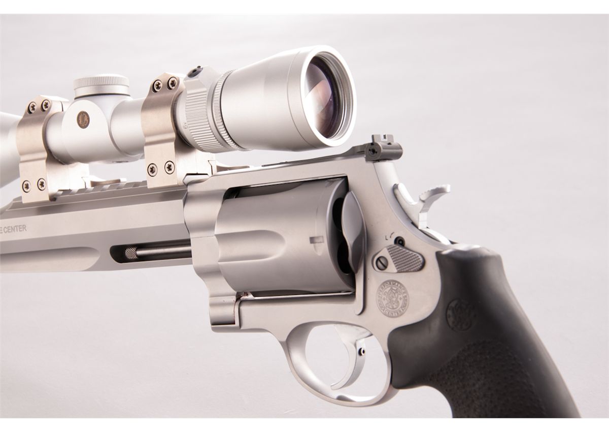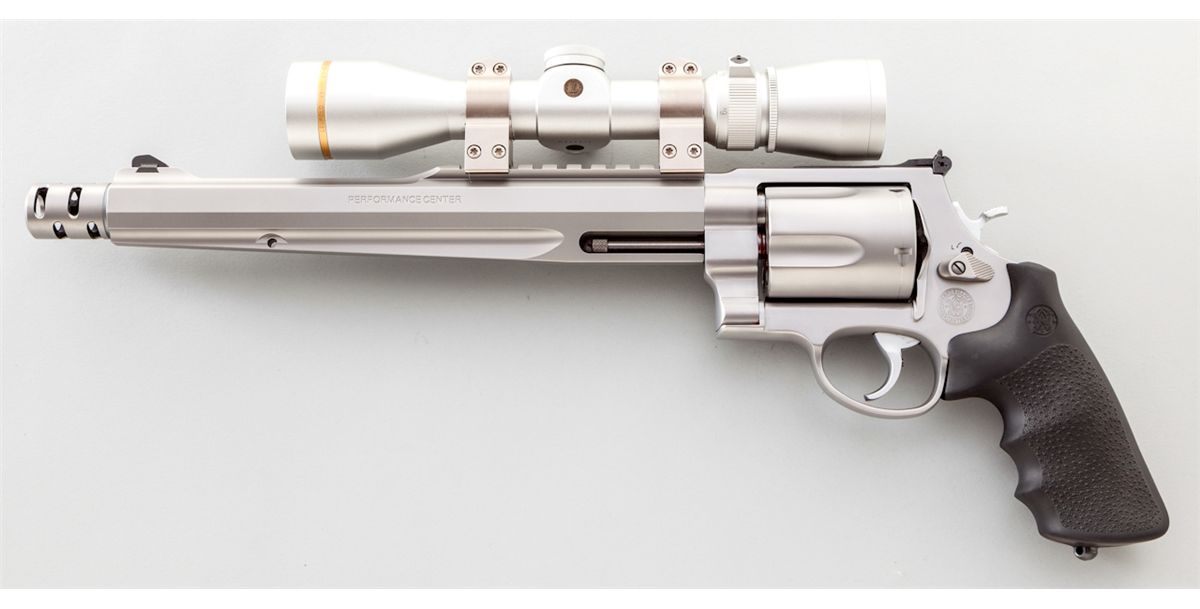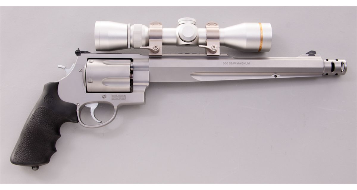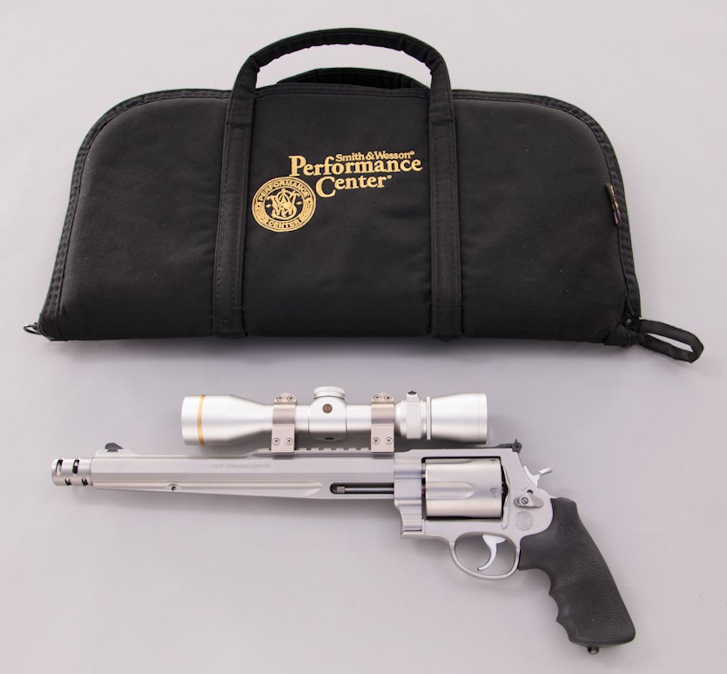 Smith & Wesson Model 500 Hunter Double Action Revolver, #JNM3308, .500 S&W mag. cal., 10-1/2'' barrel with compensator, satin stainless steel, with S&W/Hogue wraparound finger-grooved rubber grips. Topped with a bright finished Leupold VX-III 2.5-8x32 handgun scope. Touted as the most powerful production revolver in the world today, pushing a 350-grain bullet at 1975 feet per second, generating a muzzle energy of over 3000 foot pounds of force. Any of the available bullet weights can take game at ranges in excess of 200 yards. Complete in its original S&W Performance Center range bag. Condition is excellent showing very little use, with slight dragline and clear scope optics. Est.: $1,250-$1,750. (Modern)