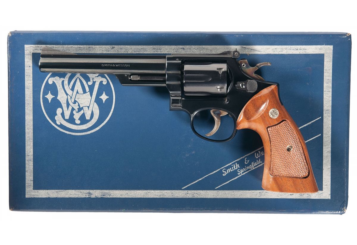 Fixed ramp front sight, adjustable rear sight, wide checkered hammer and wide serrated trigger. Fitted with checkered walnut grips with silver S&W medallions. With box numbered to gun and 6 .22 LR chamber inserts.