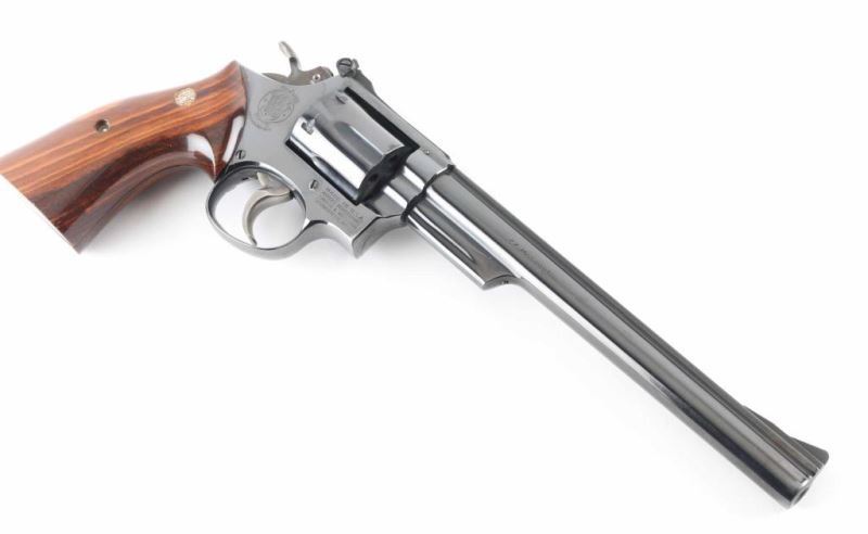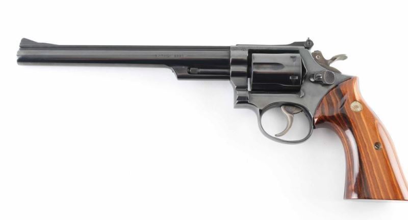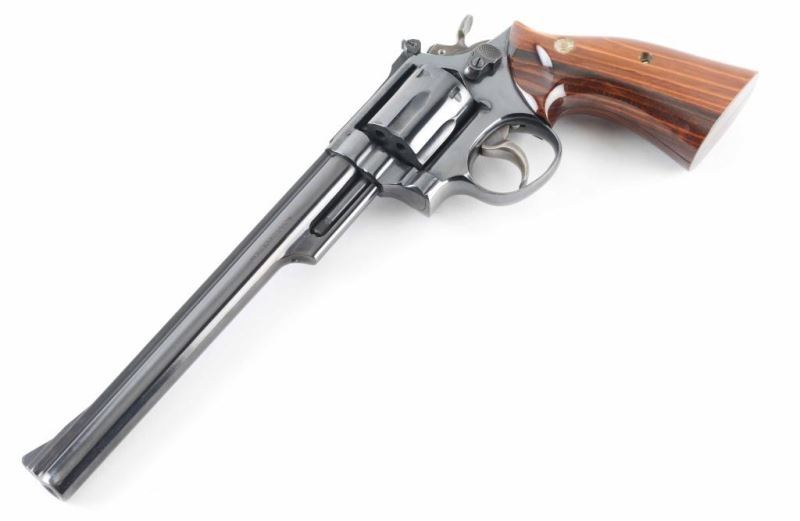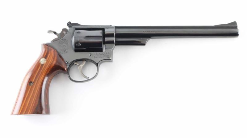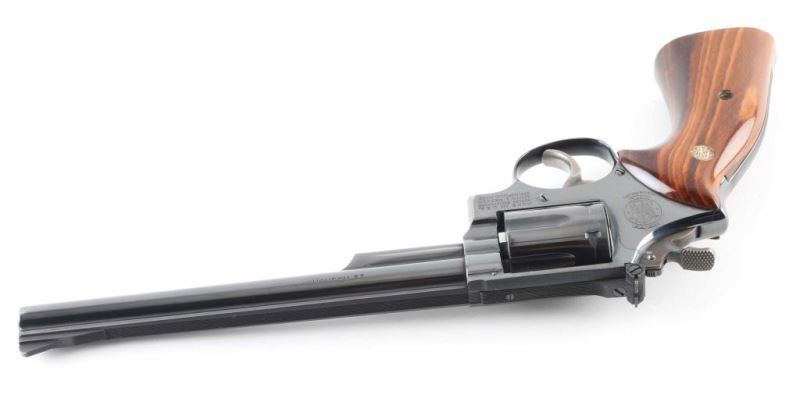 Revolver. D/S Action. 6-rd Capacity. No Dash' .22 Remington Jet/.22 Long Rifle. Produced 1961-1974. Built on a square butt K target frame with 4 screws. Counterbored cylinder. Manufactured with a switch on the hammer to select one of the dual firing pins for centerfire or rimfire. 8 3/8" serrated ribbed, pinned barrel with serrated front ramp and micro-click adjustable rear sights. 10-groove serrated fore and backstrap. Smooth rosewood grips with S&W Medallions. Smooth trigger. Wide target hammer spur. All markings are crisp/clear. Blued finish is about 98% with cylinder drag lines, and minor edge wear. Laminated grips are excellent. Action is smooth/tight. Bore and cylinders appear excellent, but slightly dirty. Less than 15,000 manufactured. NRA Condition-Near Excellent. C&R Firearm.