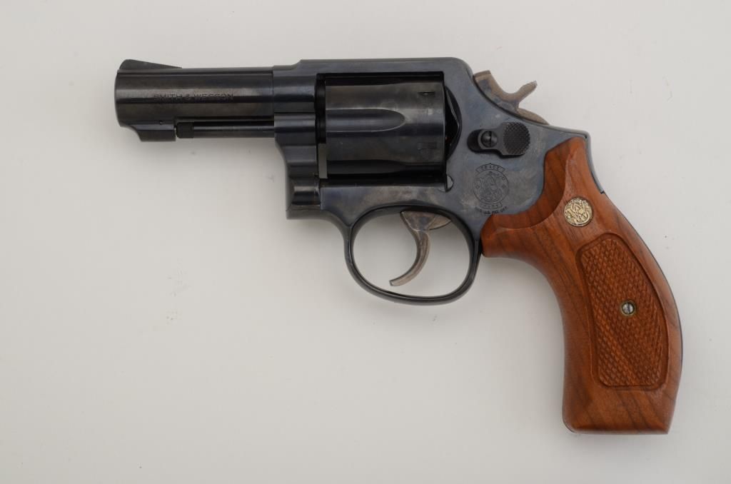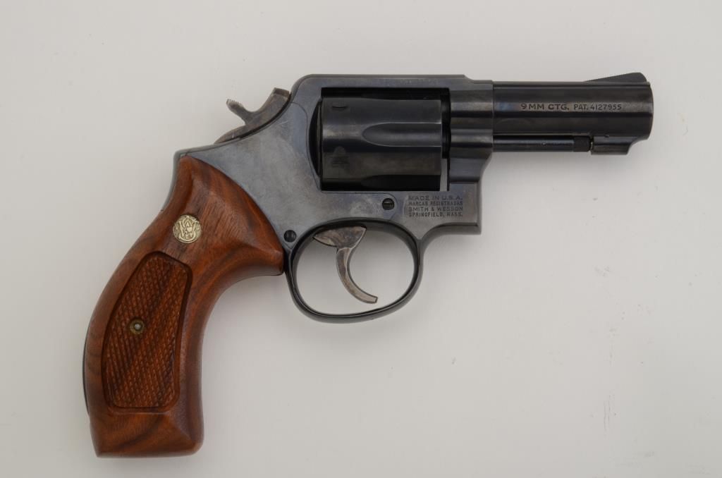 Smith & Wesson Model 547 DA revolver, 9mm cal., 3” bull barrel, blue finish, rounded butt, checkered wood medallion grips, #16D1347, in factory cardboard box with end label numbered to this gun, instructions andcleaning kit. This gun is in like new condition showing little handling; introduced in 1980, long discontinued. Est.: $500-$1,000.