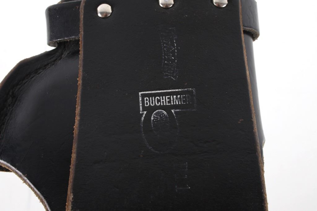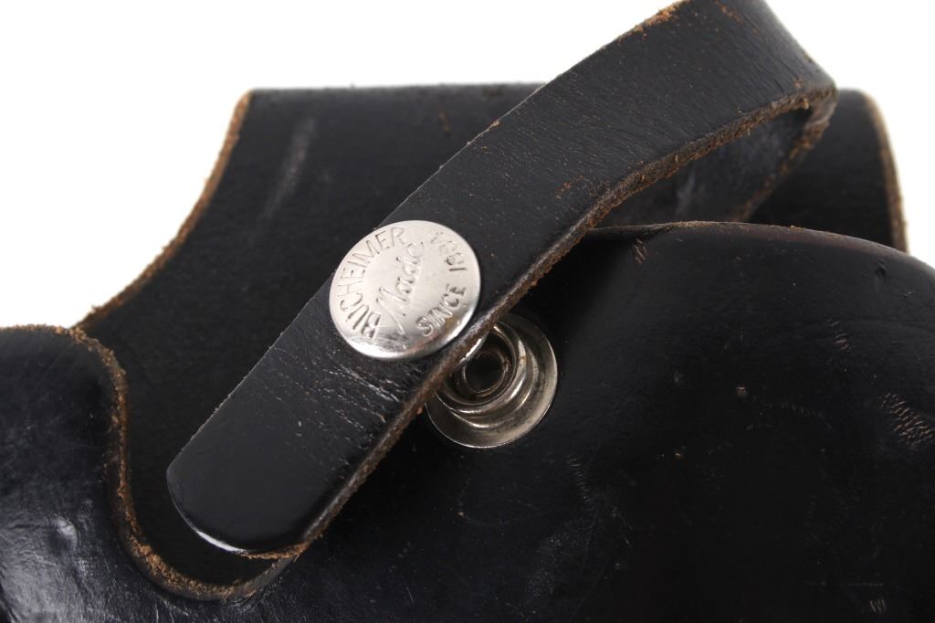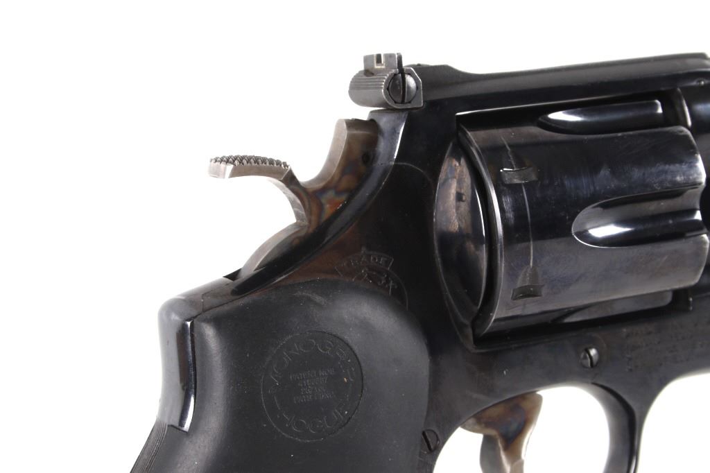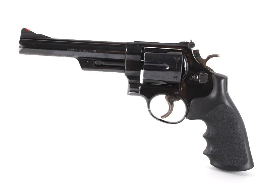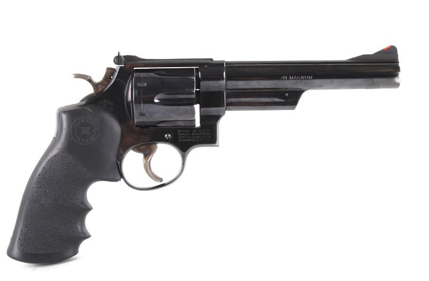 Featured in this lot is a Smith & Wesson model 57 double action revolver with leather holster and chambered in .41 magnum. This double action revolver was manufactured by Smith & Wesson and displays 5 3/4" long round barrel, six-shot cylinder, one piece rubber grips, fixed front sight, adjustable rear sight, wide case hardened trigger and hammer system, and dark finish. The revolver is marked across the left side of the barrel reading "Smith & Wesson" with the right side reading "41 Magnum". The right side of the frame is marked with the Smith & Wesson trade mark medallion partially covered by the grips with "Made in U.S.A. Marcas Registradas Smith & Wesson Springfield, Mass". The revolver shows good mechanical construction with a smooth action and crisp trigger. The revolver shows good condition overall with some light wear on the finish. It comes with a black leather Buchemier hip holster with nickel snaps. The revolver and holster show good condition with some light wear due to use. They weigh 3lbs 4oz. Serial Number: S238261. This is a modern firearm and requires a FFL transfer or NICS background check.*