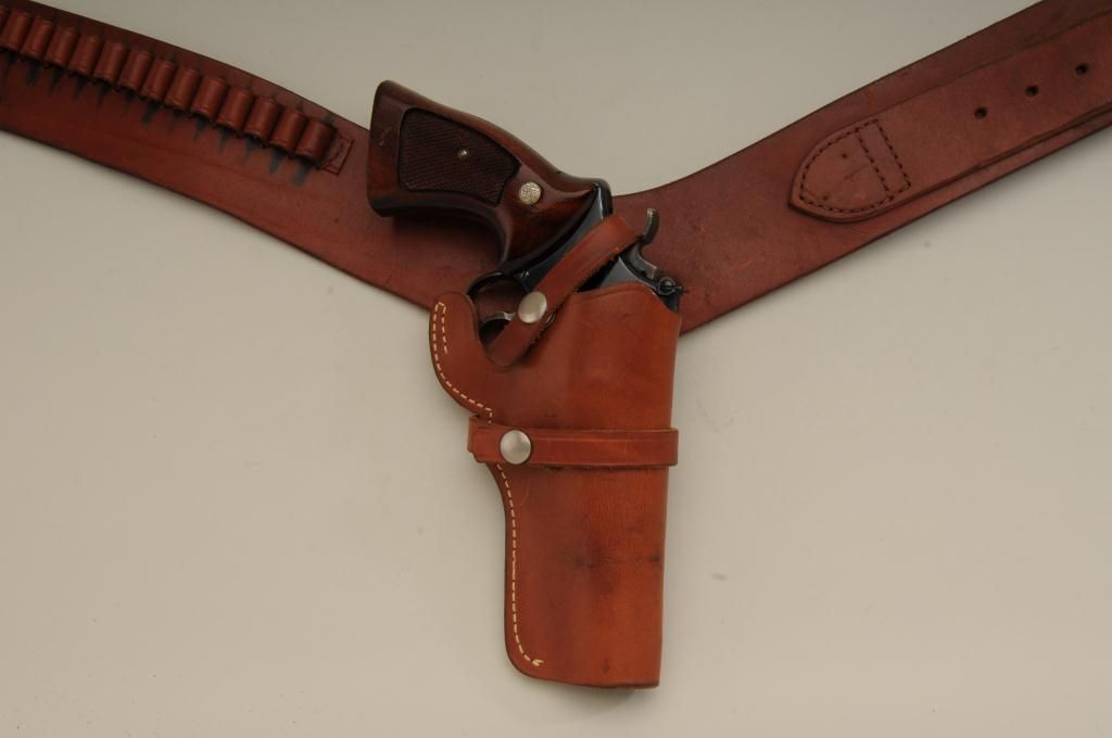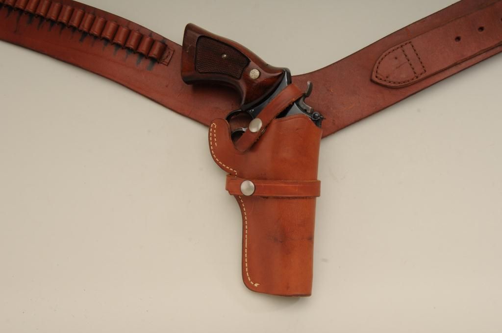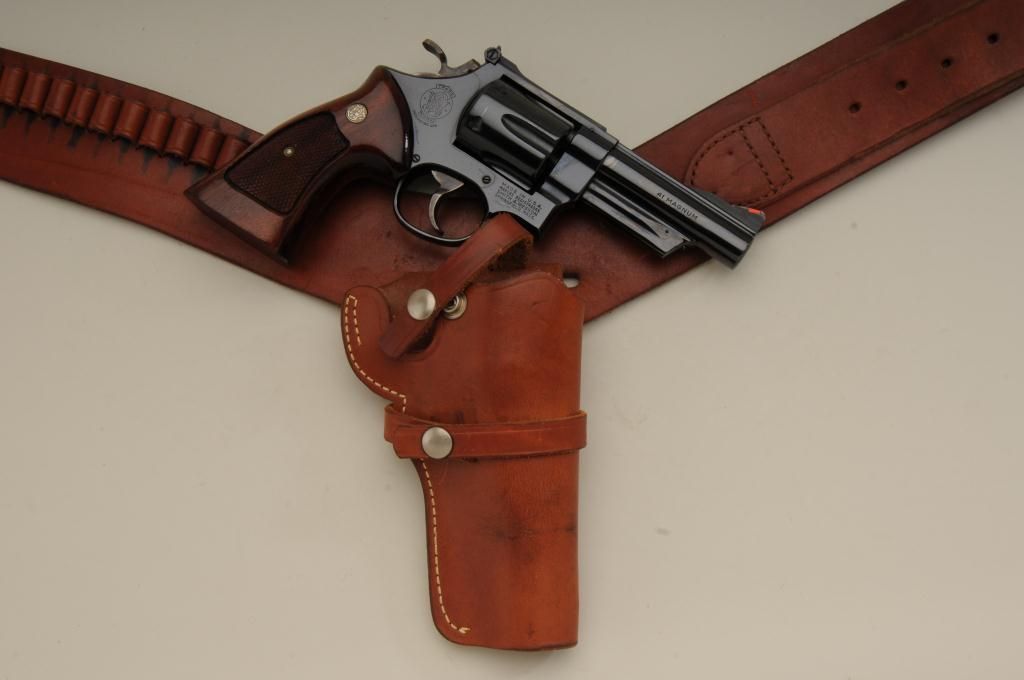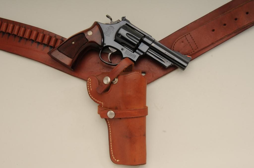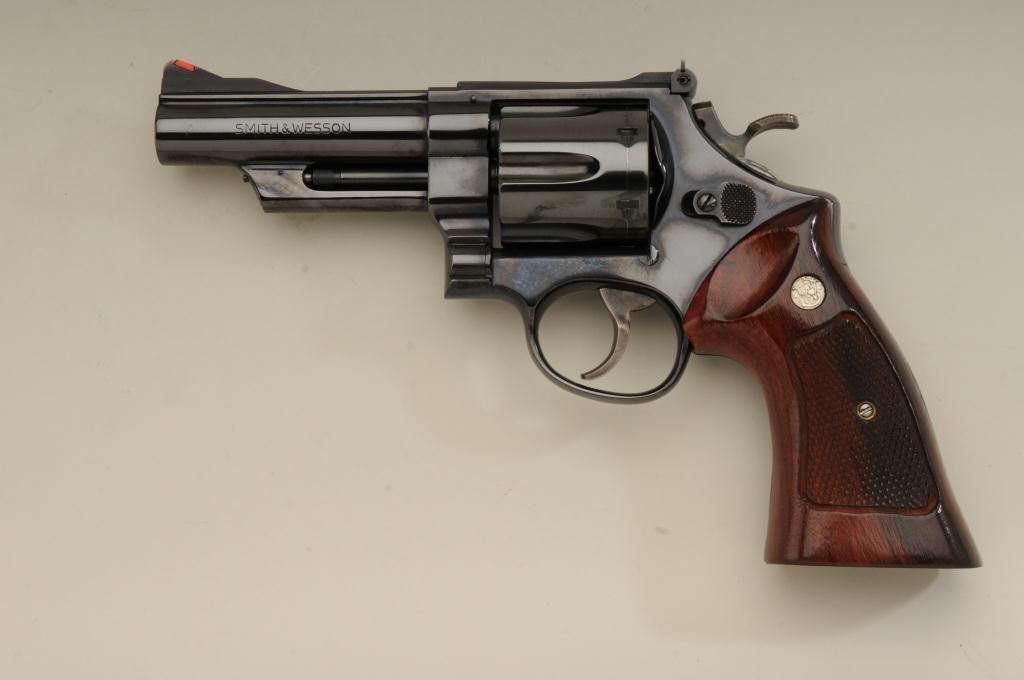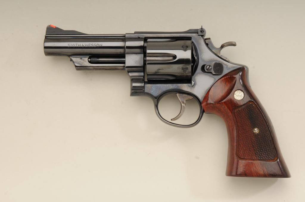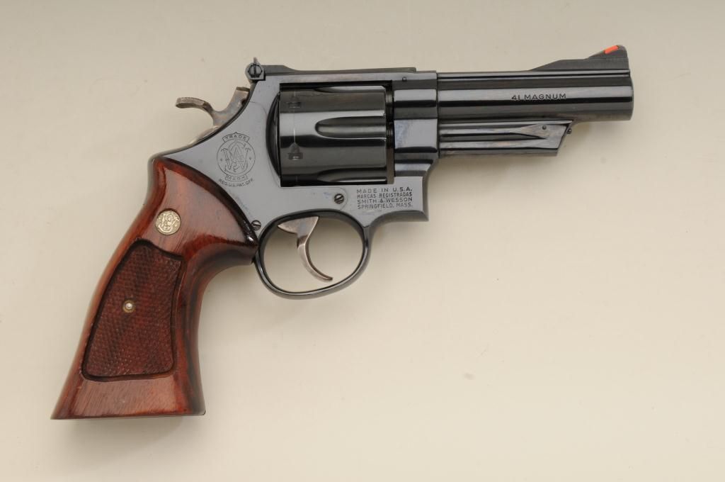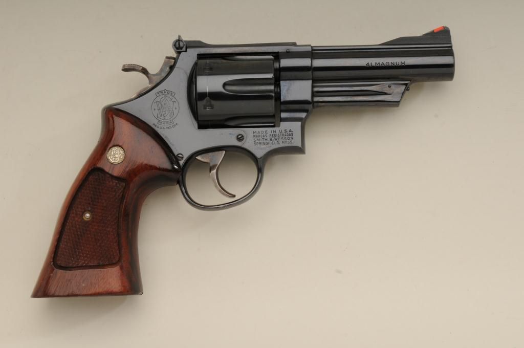 Smith & Wesson Model 57 .41 Magnum caliber double action revolver, blue finish, target hammer, target sights, target grips with factory 4 1/8” barrel, serial number N452046. This revolver remains in very good plus tonear fine used condition showing 90% to 95% original blue, some slight losses at the high points in edges with a minor index line between the cylinder stops. The grips are very good slight wear. The action is good and bore is very good. A Smith & Wesson holster and belt are included and approximately size 40 belt with cartridge loops for .41. Est.: $400- $800