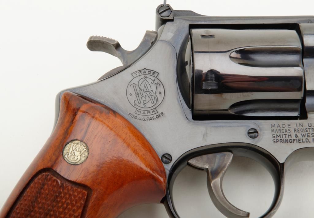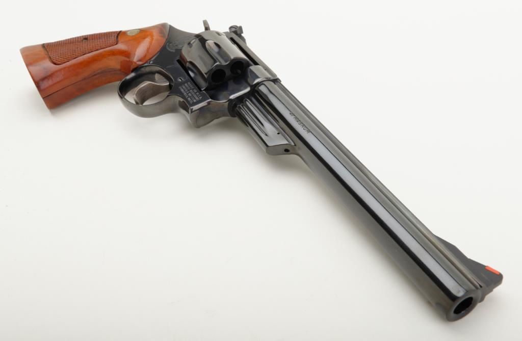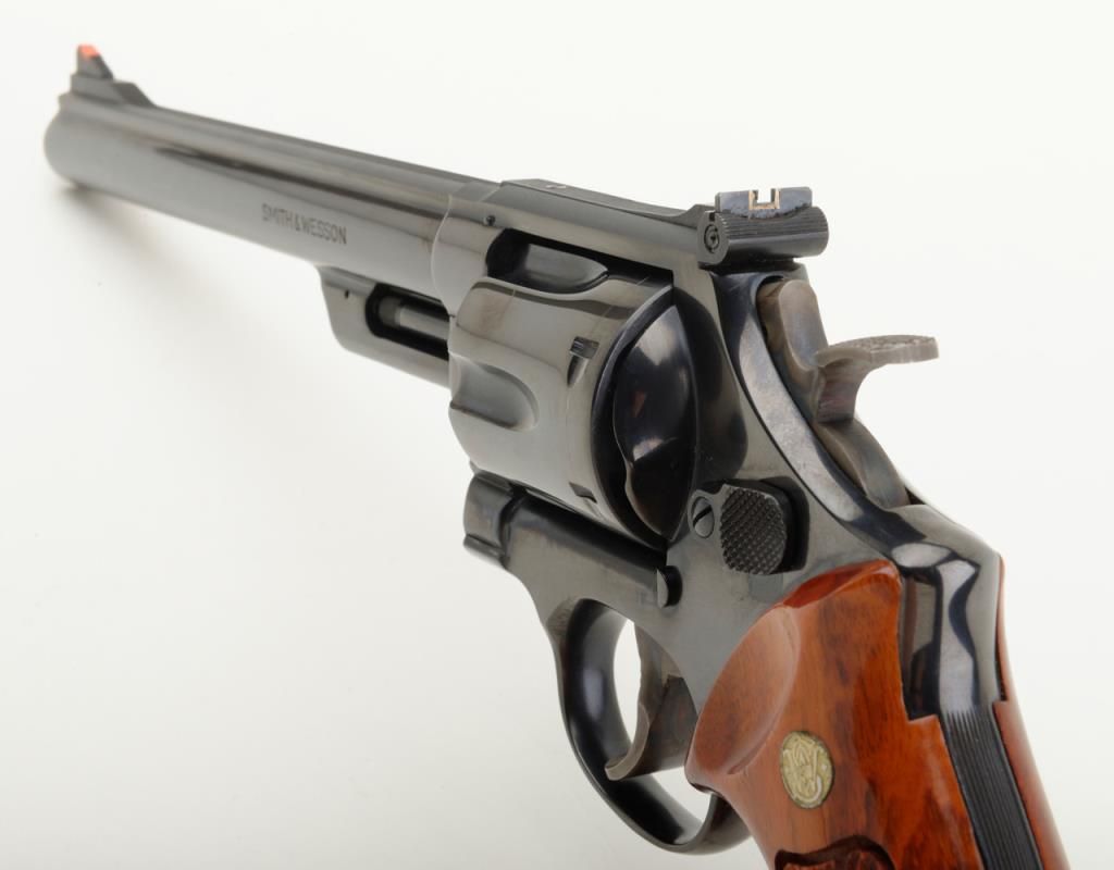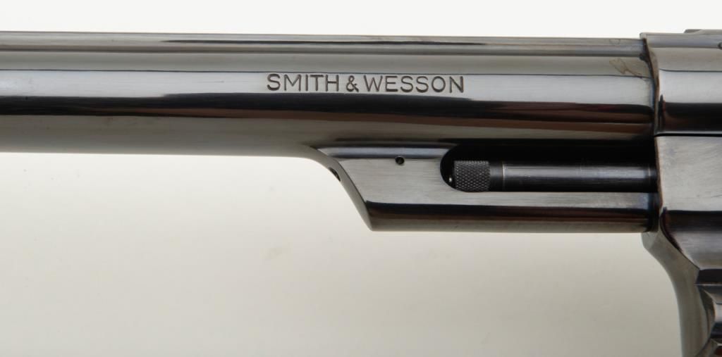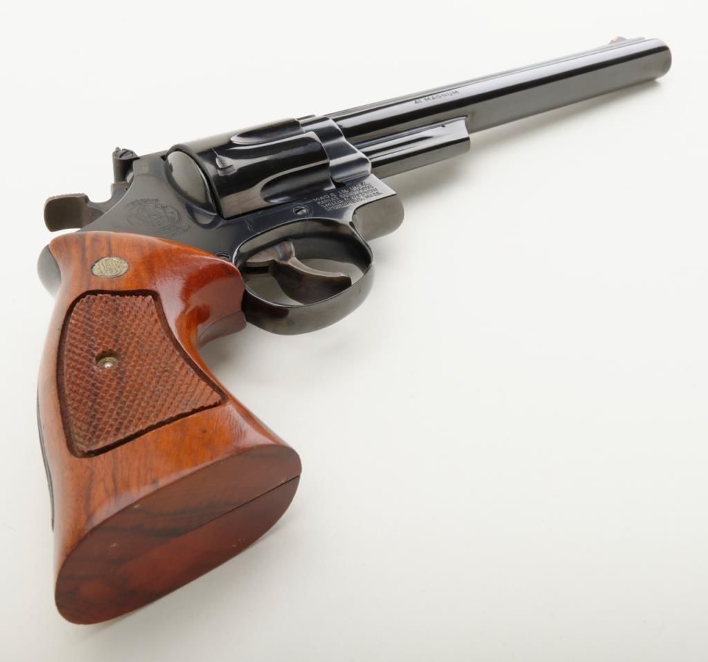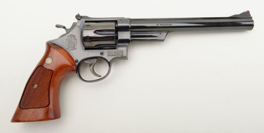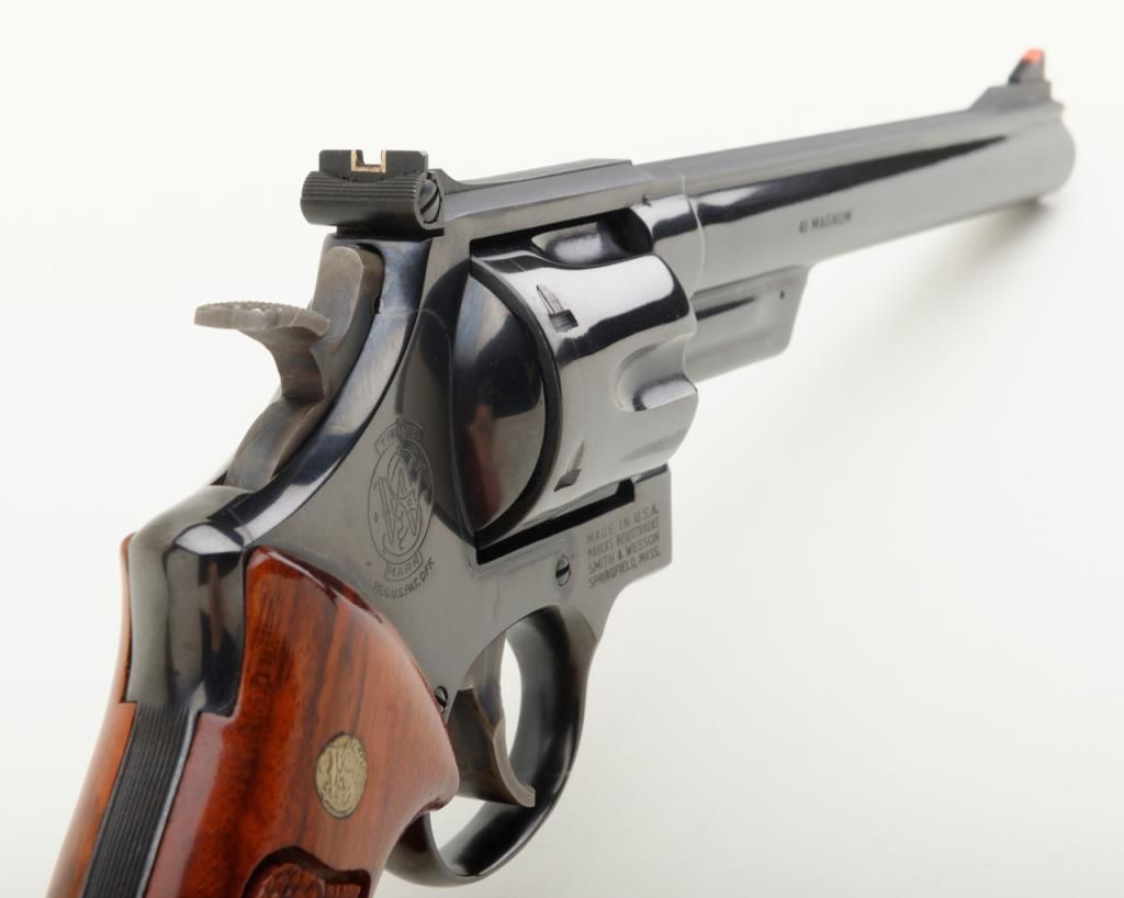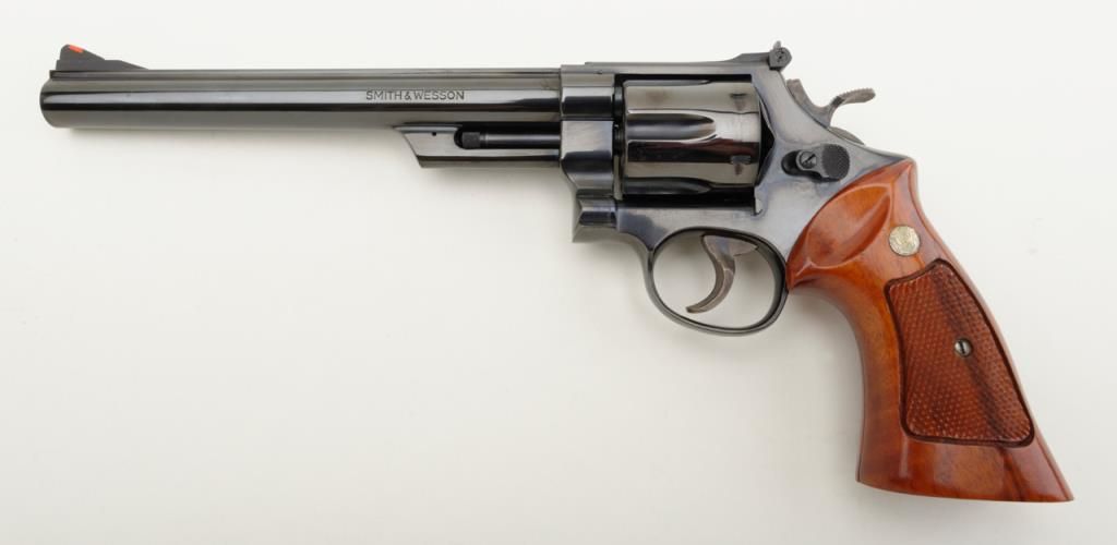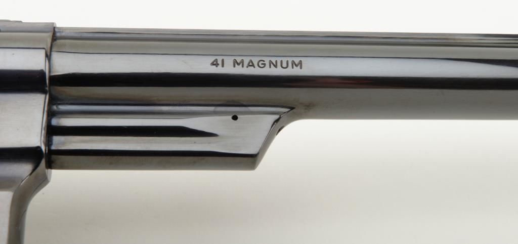 Smith & Wesson Model 57 DA revolver, .41 Magnum cal., 8-3/8” pinned barrel, blue finish, checkered wood combat medallion grips, target hammer and trigger, #N308872 in like new condition showing little use. (Modern/PPT). Est.: $400-$800.