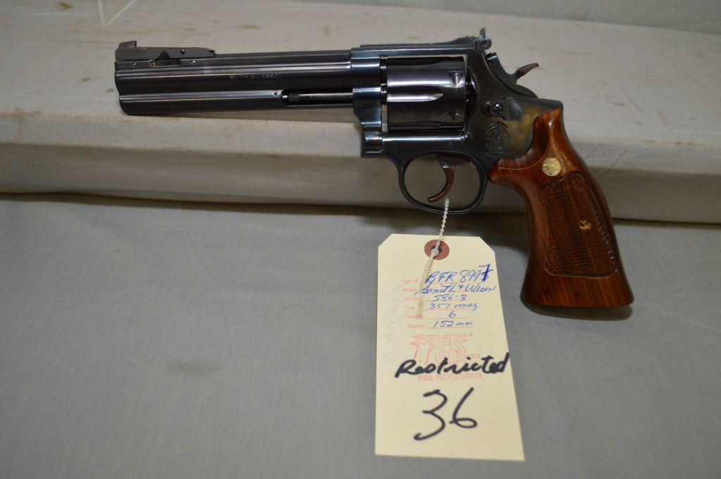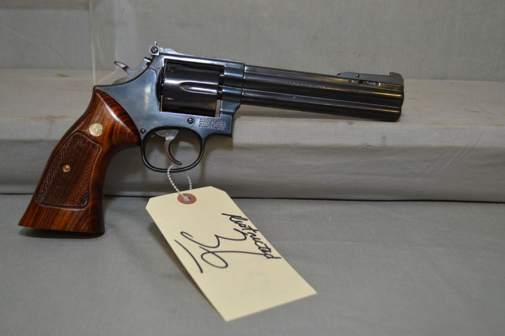 Smith & Wesson Model 586 -3 .357 Mag Cal 6 Shot Revolver w/ 152 mm bbl [ appears excellent, blued finish, slight cylinder ring, adjustable front and back sight, checkered rose wood Smith & Wesson grips ] Ser # BFR 8997 Restricted Handgun Cert # 18559741