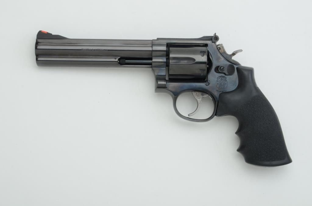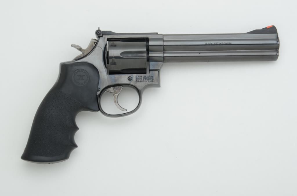 Smith & Wesson Model 586-3 DA revolver, .357 Magnum cal., 5-3/4” barrel, blue finish, stippled finger groove Hogue Monogrips, #BBJ3432 with factory blue cardboard box, cleaning kit and instructions. This gun is in like new condition showing little handling. Est.: $400-$800.