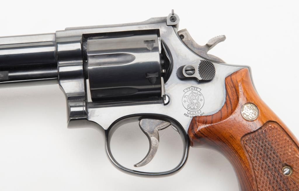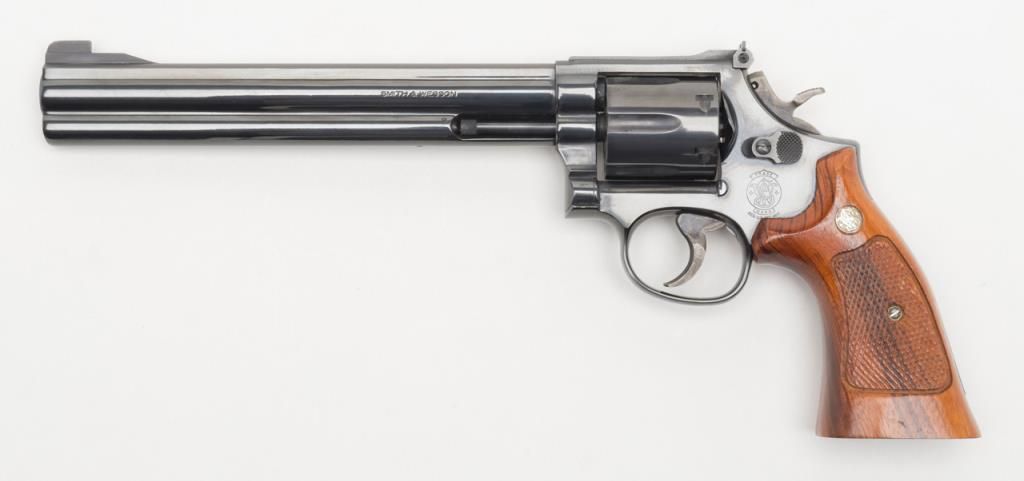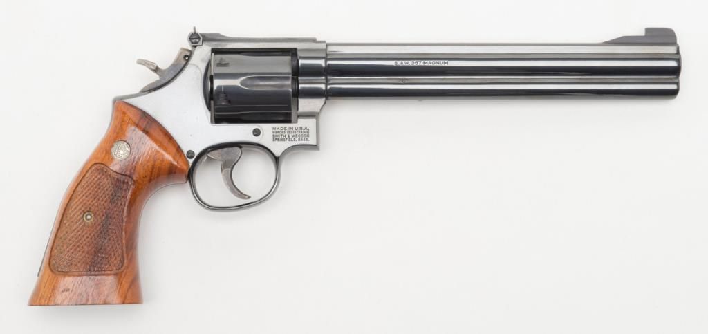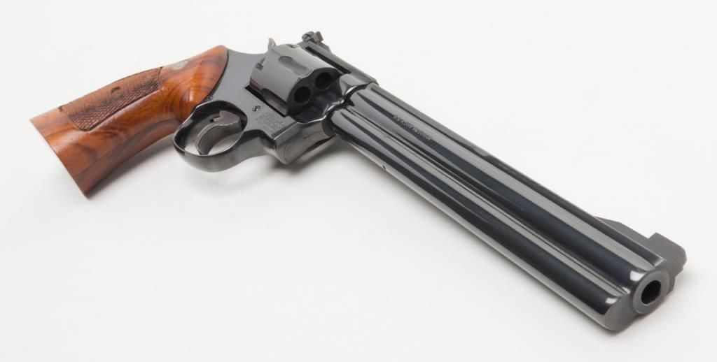 Smith & Wesson Model 586 DA revolver, .357 Magnum cal., 8-3/8” barrel, blue finish, checkered wood combat medallion grips, #ADD9004 in overall fine condition showing little use; majority of original finish, fine bore, crisp action, sharp markings,fine grips, target hammer and trigger. (Modern/No Sale to Calif. Resident). Est.: $400-$600.