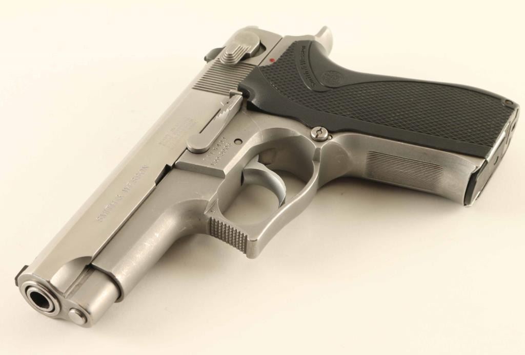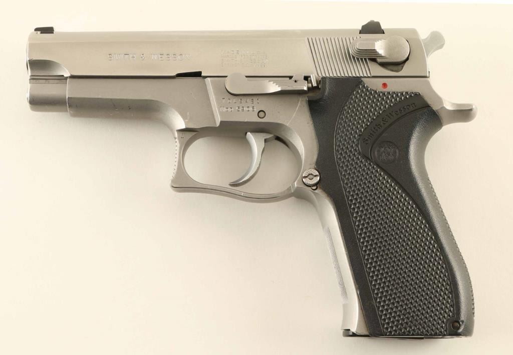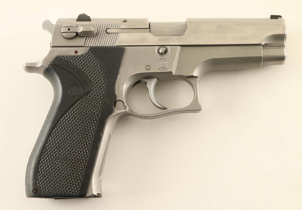 Semiautomatic pistol features stainless steel construction, checkered black plastic grips, double/single action trigger, 4" barrel, 3 dot sights in dovetails, slide mounted ambidextrous decocking safety. Bore is very good condition. Metal surfaces are overall very good, with scratches and scuffs. Sides of slide appear polished, with "magazine caution" warning text on right side barely readable. Grips are good to very good. Includes one magazine. Condition is NRA Very Good *** Modern Firearm ***
