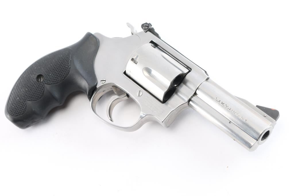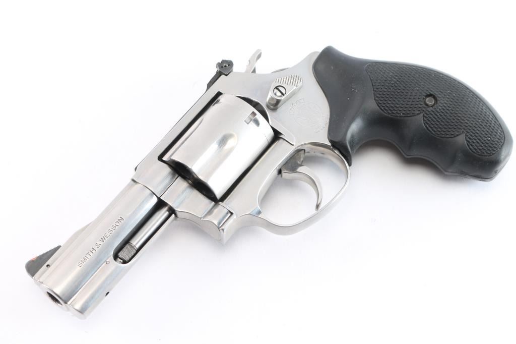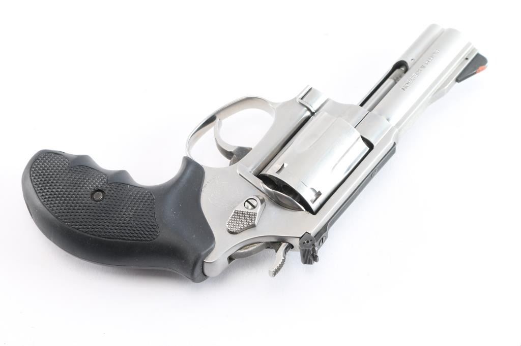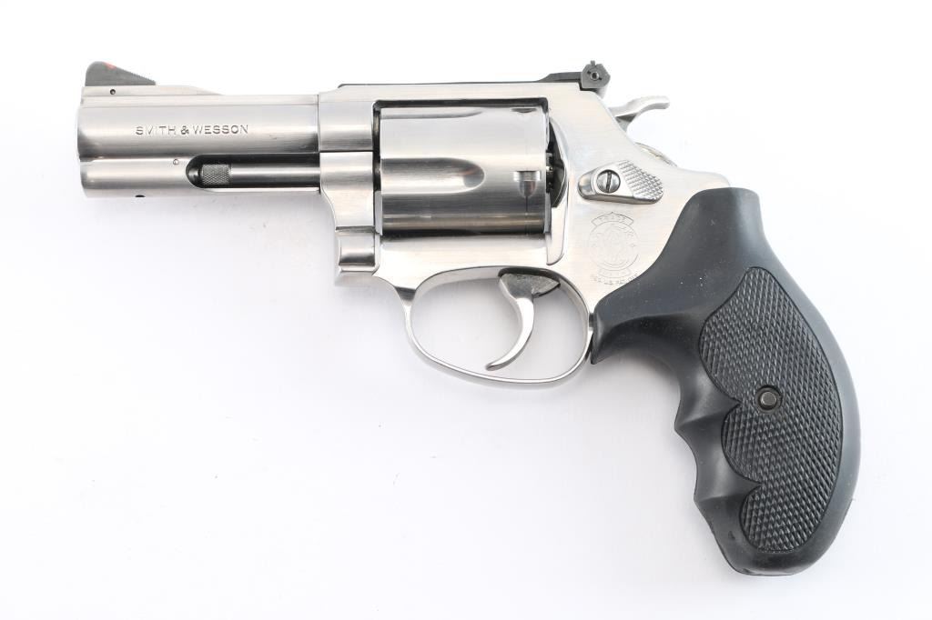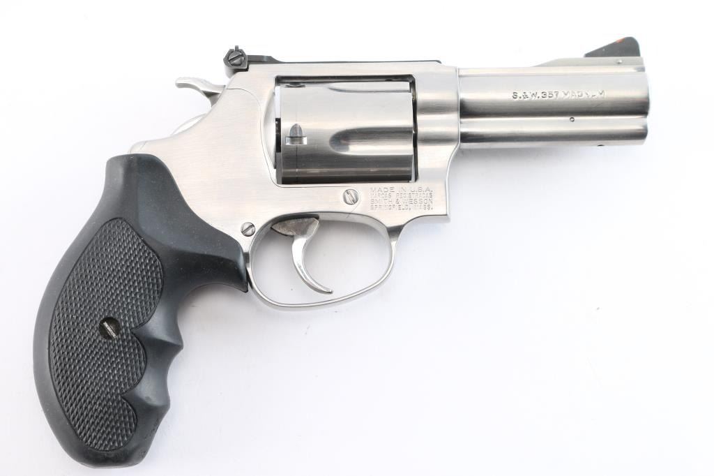 'Chiefs Special,' an American made double-action revolver built on the magnum 'J' frame, chambered for .357 Magnum. Manufactured circa 1996 in Springfield, MA. This target variation features a satin stainless finish, 3" serrated ribbed barrel, shrouded ejectore rod, full underlug, pinned serrated ramped blade front sight, micrometer adjustable notched rear sight, smooth curved polished color-case trigger, polished color-case hammer, checkered hammer spur, five-shot fluted cylinder, three-screw round butt magnum 'J' frame, and two-piece black checkered rubber finger grooved grips. The original satin stainless finish retained is approximately 99% with only superficial blemishes, and a drag line on the cylinder. Metal displays no rust or deformation. The rubber grips are in excellent condition. Bore is bright with strong rifling, and the cylinder chambers are excellent. Action is smooth and crisp with a tight lock-up.