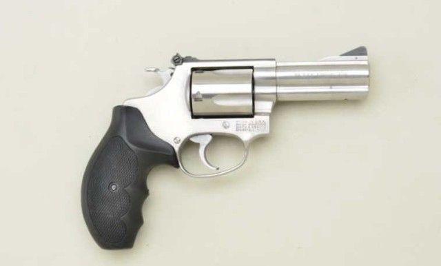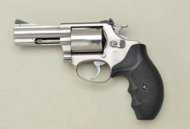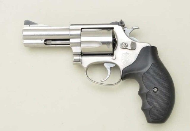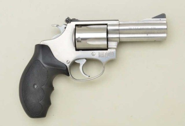 Smith & Wesson Model 60-4 DA revolver, .38 Special cal., desirable 3” barrel, stainless steel, finger groove checkered hard rubber combat grips, #BNC9691. This gun is in overall fine condition with a fine bore,crisp action and markings, fine after-market grips. Est.: $250-$350.