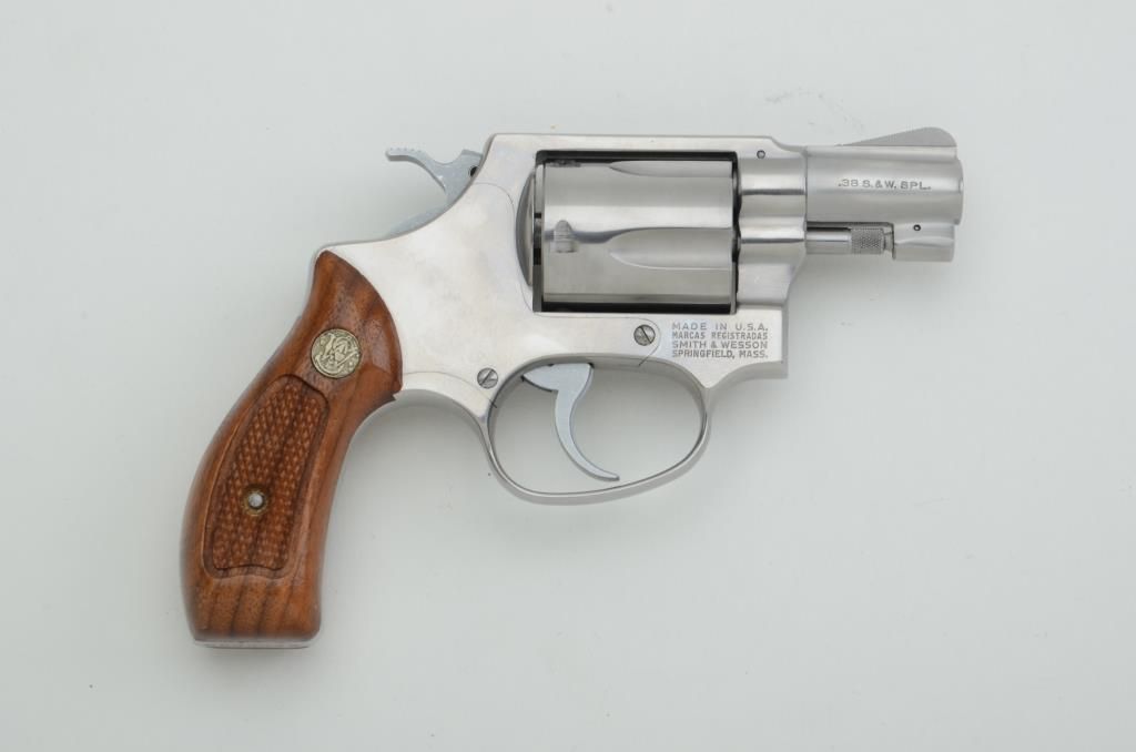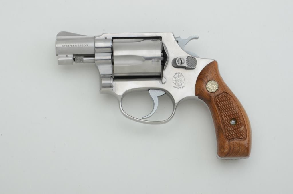 Smith & Wesson Model 60 DA revolver, .38 Special cal., 2” barrel, stainless, checkered wood medallion grips, #R258689. This gun is in overall like new condition showing little handling. Est.: $250-$350.