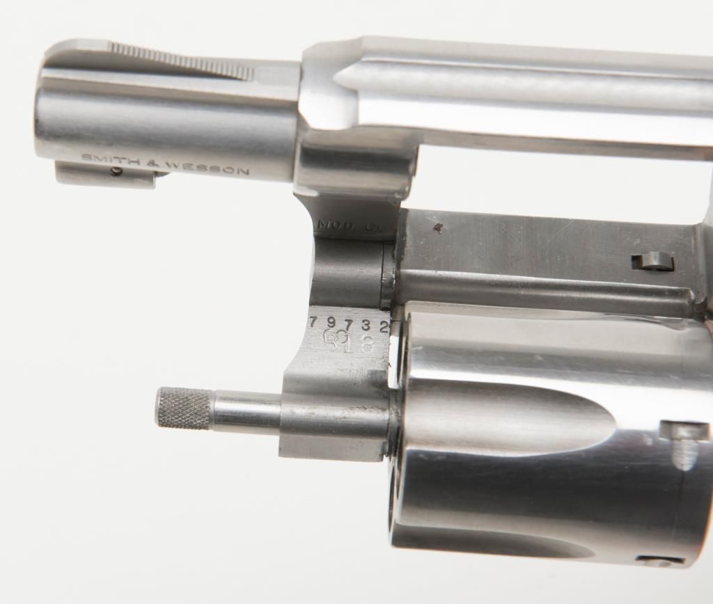 Smith & Wesson Model 60 (no dash) DA revolver, .38 Special cal., 2” barrel, stainless, checkered wood medallion grips, #ACT8000 in overall fine condition with a fine bore, crisp action and fine grips; accompanied by a Hunter brand leatherholster. From the estate of Joe Kiser. (Modern/No sale to California Residents). Est.: $400-$800.