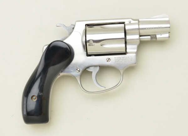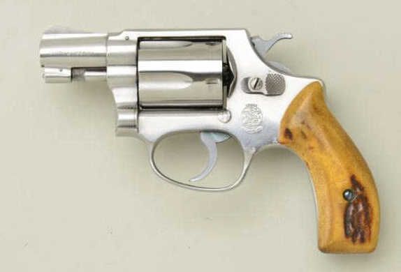Smith & Wesson Model 60 (no dash) DA revolver, .38 Special cal., 2” barrel, stainless steel, combination stag and plastic grips, #R22676. This gun is in fine to excellent condition with a fine bore, crispaction, sharp markings and custom after-market grips; a favorite of lawmen for many years as a back-up piece. Est.: $250-$350.