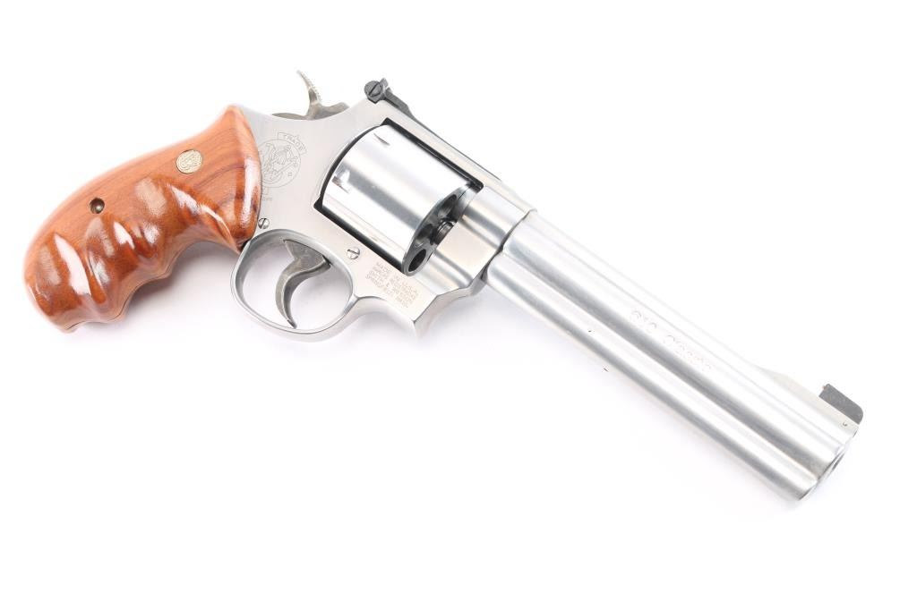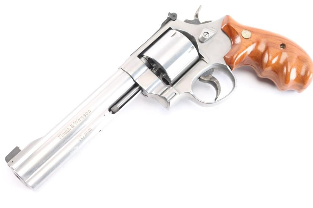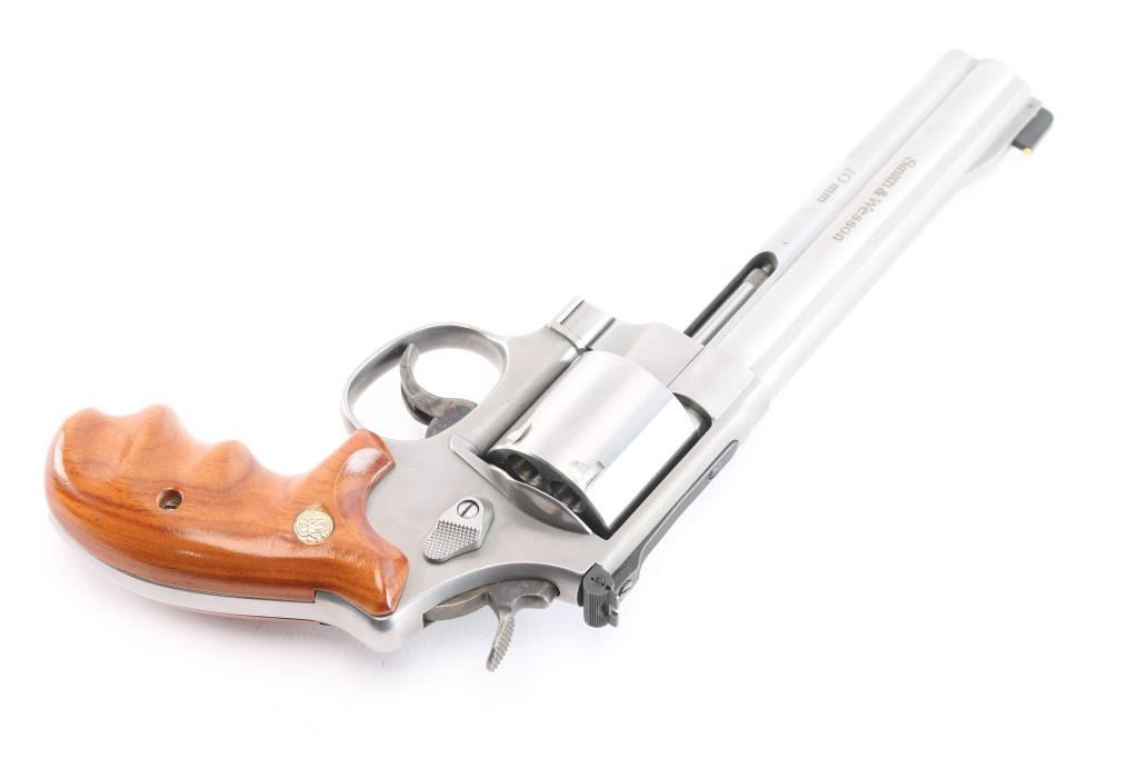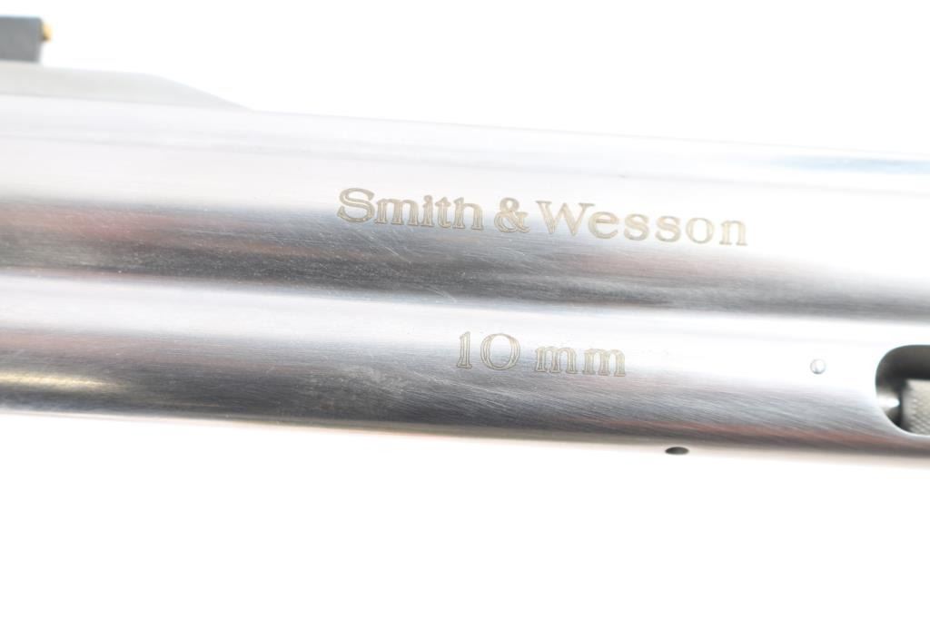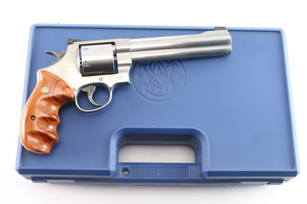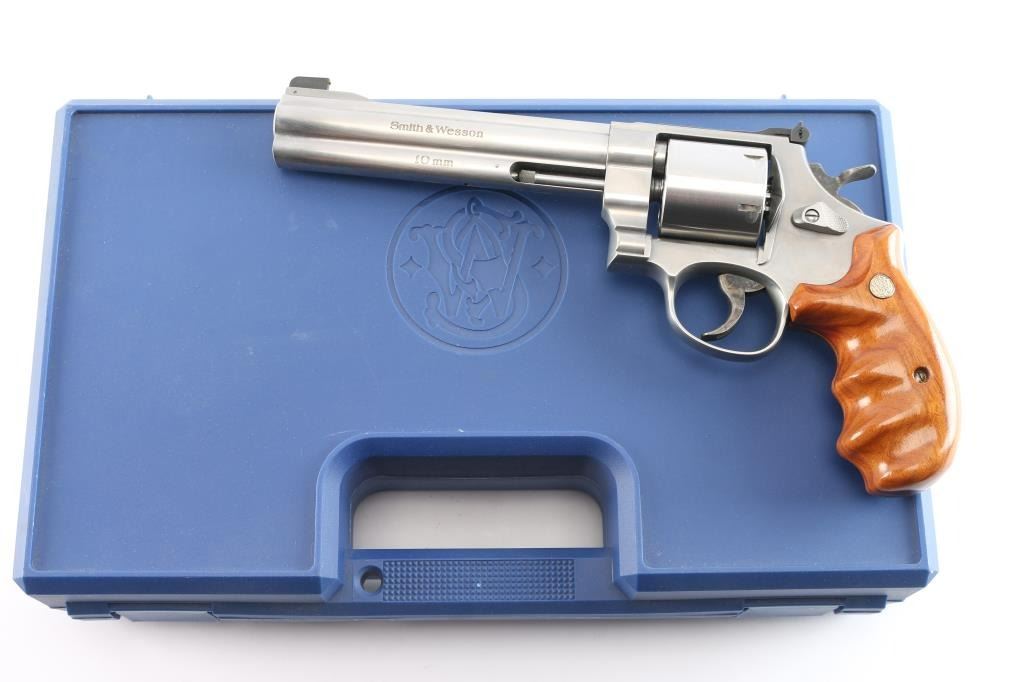 The large frame 'Classic Hunter,' a stainless steel double-action revolver chambered in 10mm, manufactured circa 1998-2001. Features a brushed finish, 6 1/2" barrel, shrouded ejector rod, full underlug, serrated top rib, partridge front sight with brass insert, micrometer click adjustable rear sight with white outline, non-fluted six-shot cylinder, smooth curved target trigger, target hammer, checkered hammer spur, round butt N target frame, and two-piece finger-grooved hardwood grips with S&W insignias. Revolver's original stainless finish retained is approximately 98% with modest handling marks and a light drag line on the cylinder. Action is smooth with tight lock-up. The bore is bright with strong rifling, and the cylinder looks excellent. The metal displays no deformation, but there is a small undetermined blemish on the front of the underlug. Wood grips are in excellent condition with only one small dark spot on the left side by the cylinder release. Includes the original factory hard case with documents, and lock.