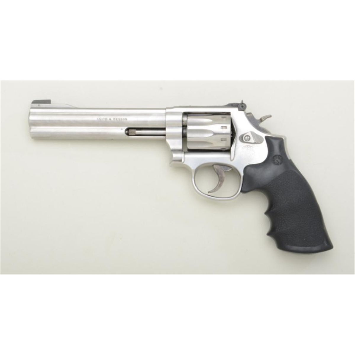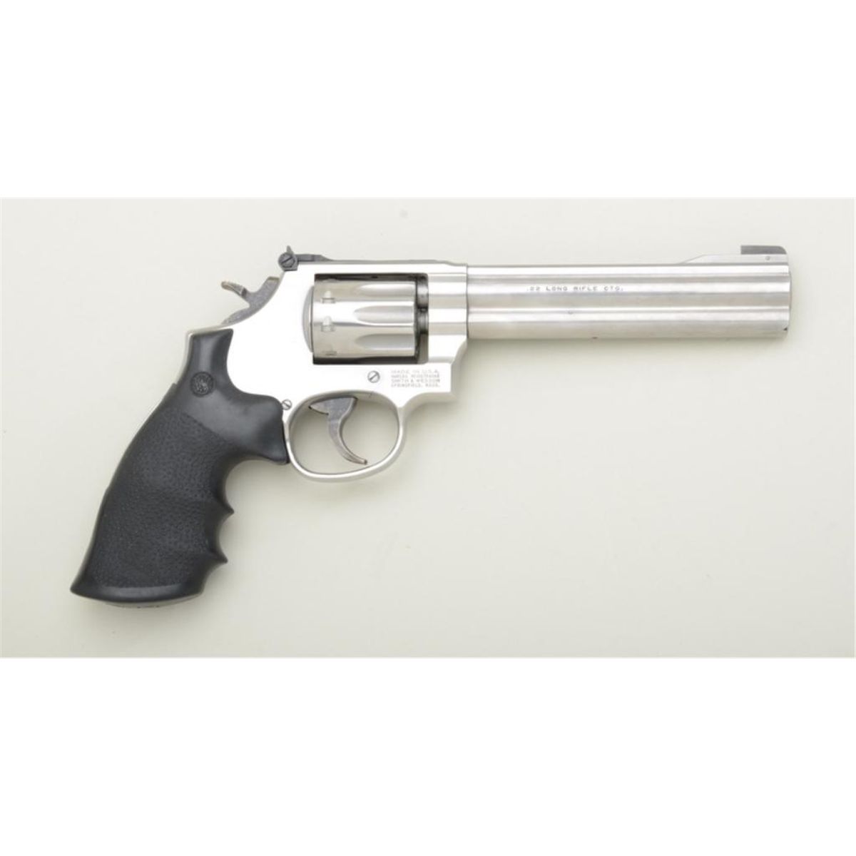 Smith & Wesson Model 617-4 Plus DA 10-shot revolver, .22LR cal., 6” barrel, stainless steel, checkered S&W stippled finger groove hard rubber grips by Hogue, #CDM9742. This gun is in overall fine condition with a finebore, crisp action and markings, adjustable rear sight, fine grips. Est.: $450-$650.