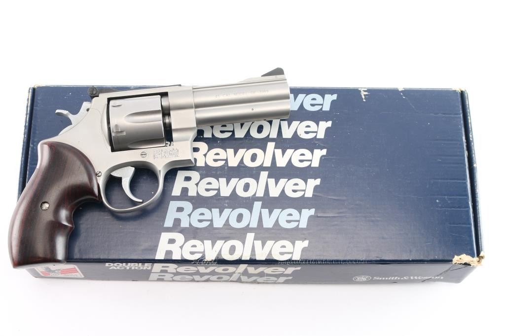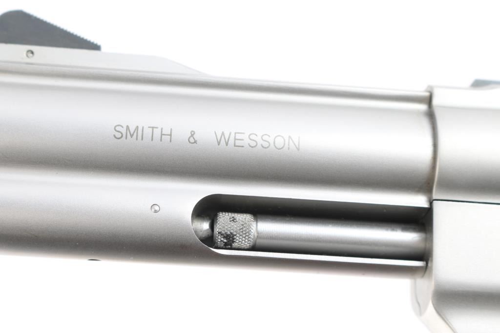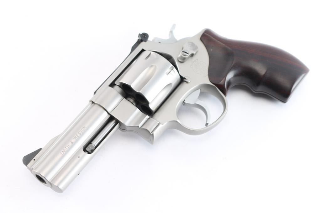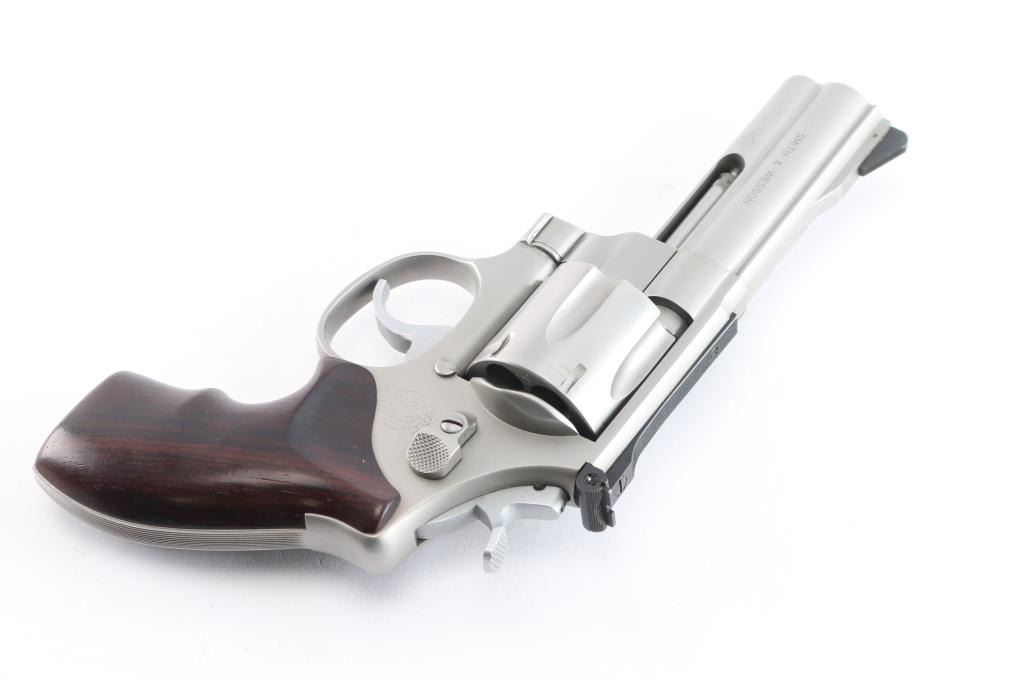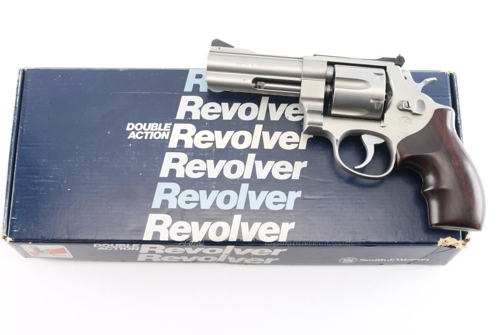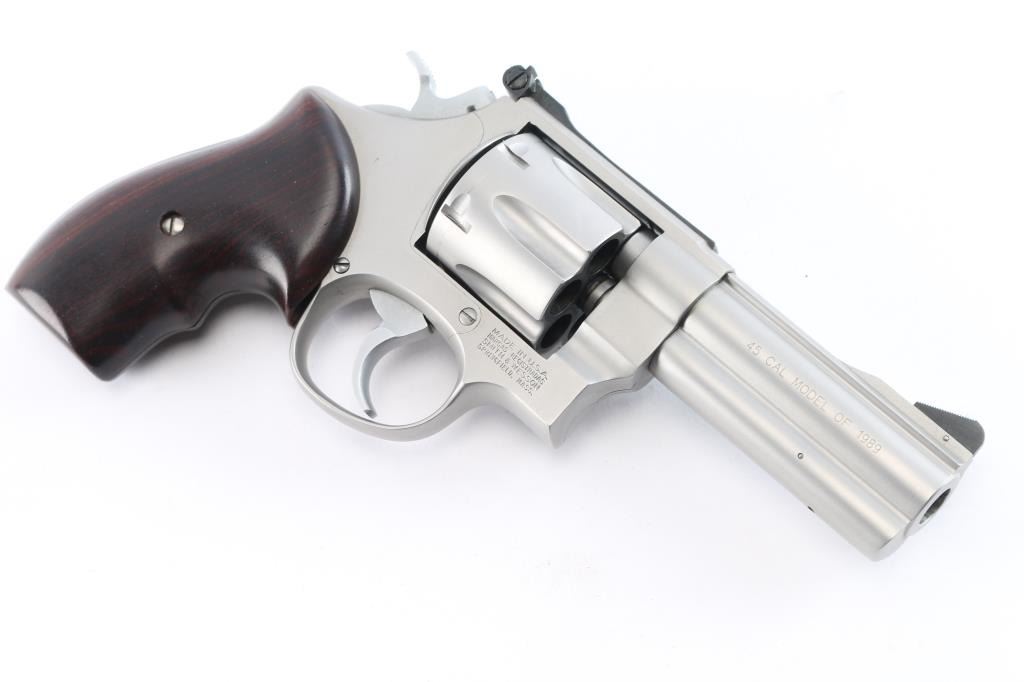 The “.45 CAL MODEL OF 1989” is an American made double-action revolver chambered for the .45 ACP rimless cartridge. Manufactured circa 1989 in Springfield, MA. Revolver features a matte stainless round butt 'N' target frame with 3 screws, 5" barrel, fluted six-shot cylinder, smooth finger grooved wood grips, serrated full barrel rib, shrouded ejector rod, full underlug, serrated ramped front sight, firing pin on hammer nose, smooth curved trigger, ten groove serrated front and backstrap, and micrometer adjustable square notch rear sight. Bore is bright with strong rifling, and the cylinder looks excellent. The original stainless finish retained is approximately 99% with only superficial scratches, and a light drag line on the cylinder. Metal shows no rust or deformation, and the action is smooth with tight lockup. The grips are excellent. Comes with factory box and paperwork.