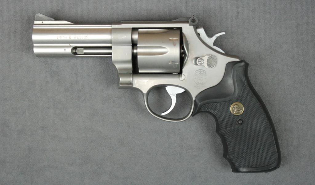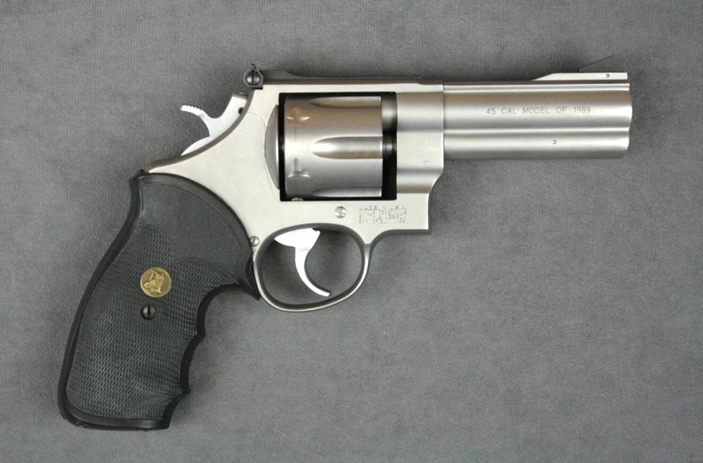 Smith & Wesson Model 625-3 Model of 1989 DA revolver, .45 cal., 4” barrel, satin nickel finish, Pachmayr combat hard rubber grips, #BEK9873. This gun is in overall excellent condition showing little use or handling;cylinder shows a drag line, bore is excellent, action crisp, markings sharp, fine grips, ramp front sight, adjustable rear sight. Est.: $400-$800.