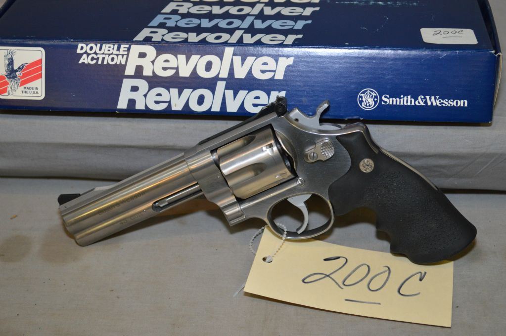 Smith & Wesson Model 625 Classic .45 Colt Cal 6 Shot Revolver w/ 127 mm bbl [ appears excellent, in orig box w/booklet, etc. , box marked Special , stainless finish, adjusable rear sight, Smith & Wesson insignia rubber grips, slight cylinder ring ] Ser # SDS 0444 Restricted Handgun Cert # tci Old # L-104399