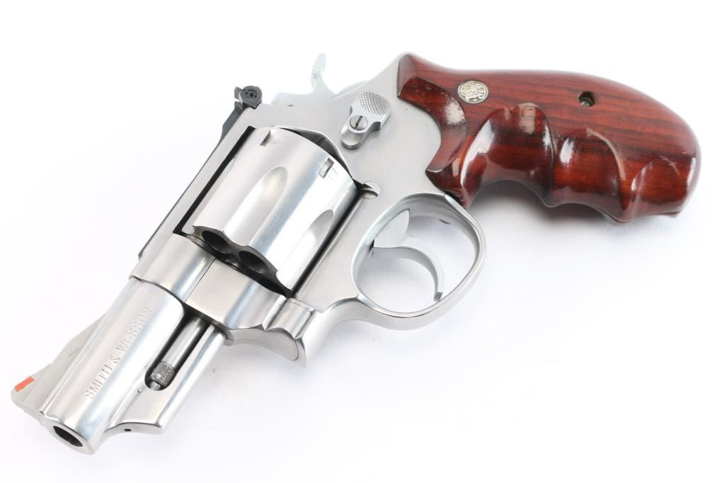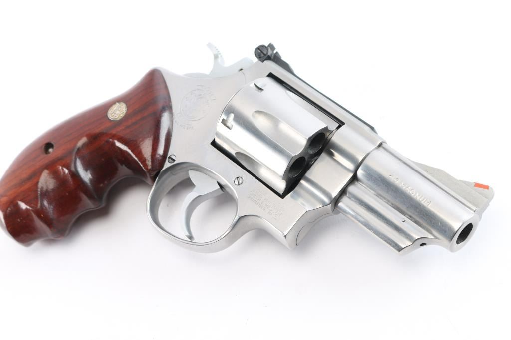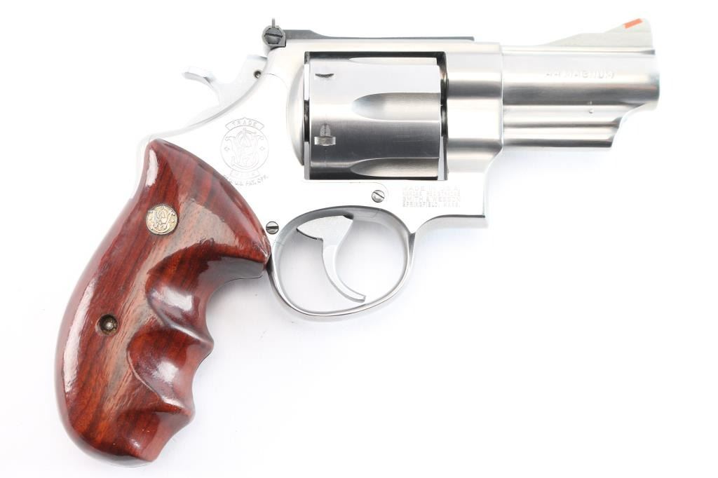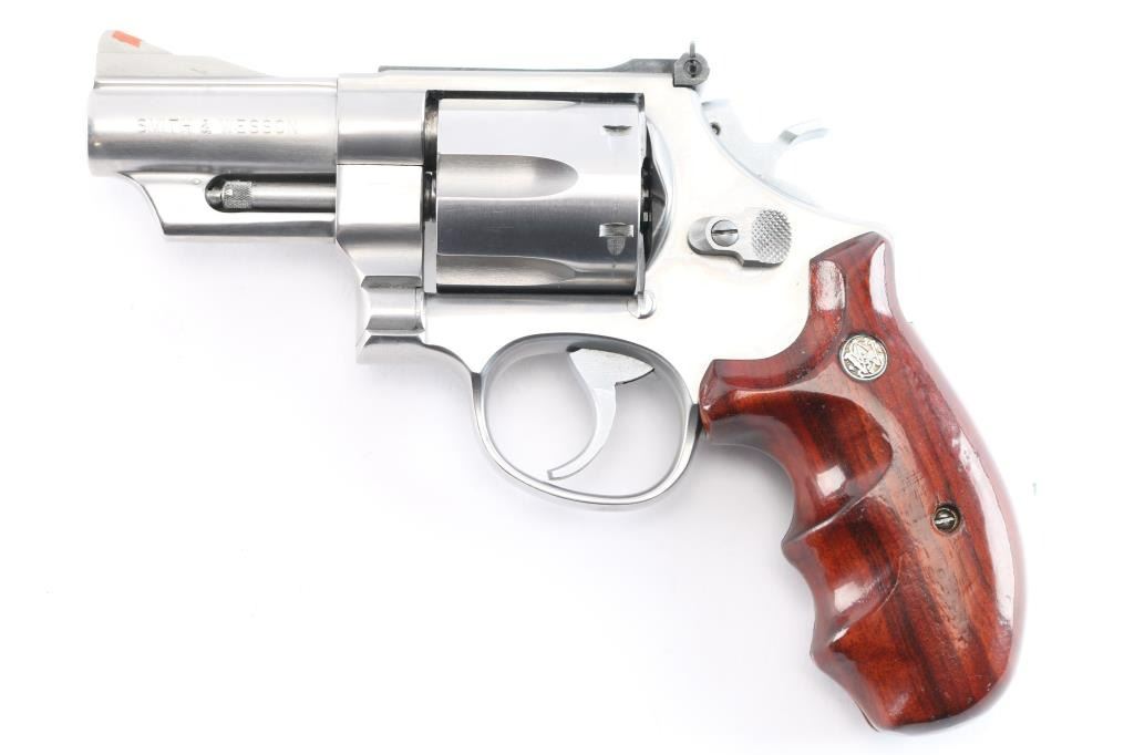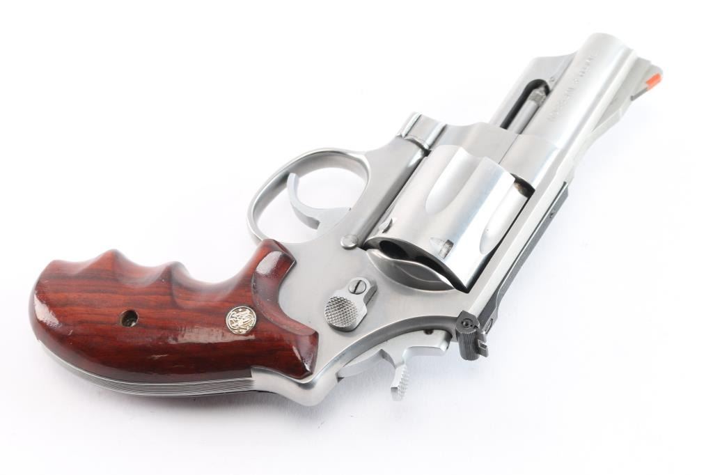 American made large frame stainless steel double-action revolver chambered in .44 Magnum. The Model 629-1 was introduced in 1982, and manufacture in Springfield, MA. This 629-1 was distributed by Lew Horton and S&W, and only 8,000 were made between 1986-1987. Featuring a brushed stainless steel finish, 3" barrel with partial serrated sighting rib, shrouded ejector rod, 3/4 length underlug, raised serrated ramped front sight with orange insert, adjustable micrometer notched rear sight with white outline, fluted six-shot cylinder, smooth wide curved stainless trigger, firing pin on hammer nose, stainless hammer, checkered hammer spur, ten-groove serrated grip straps, smooth finger grooved wood combat grips with gold-colored S&W medallions, and three screw round butt 'N' target frame. Original stainless finish retained is approximately 98% with superficial scratches, and a light drag line on the cylinder. Metal displays no rust or deformation, but the cylinder sticks when attempting to open it. Wood grips are in excellent condition. Bore is bright with strong rifling, and the cylinder chambers are also very good, but need a cleaning. Action functions soundly with a tight lock-up. Pistol would be excellent if the cylinder did not stick when opening.