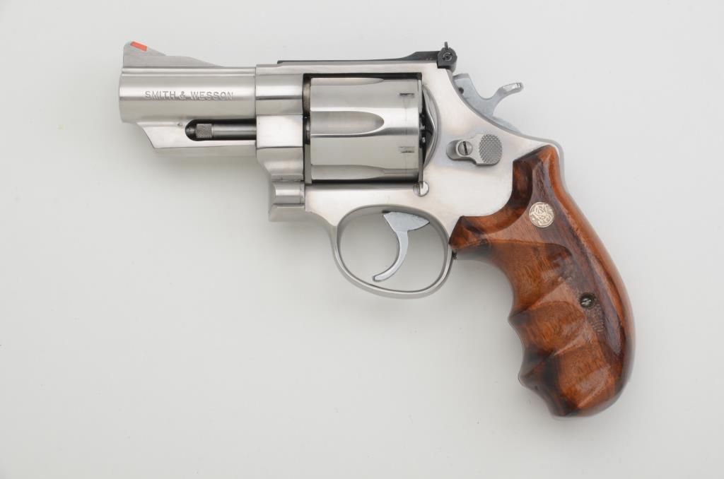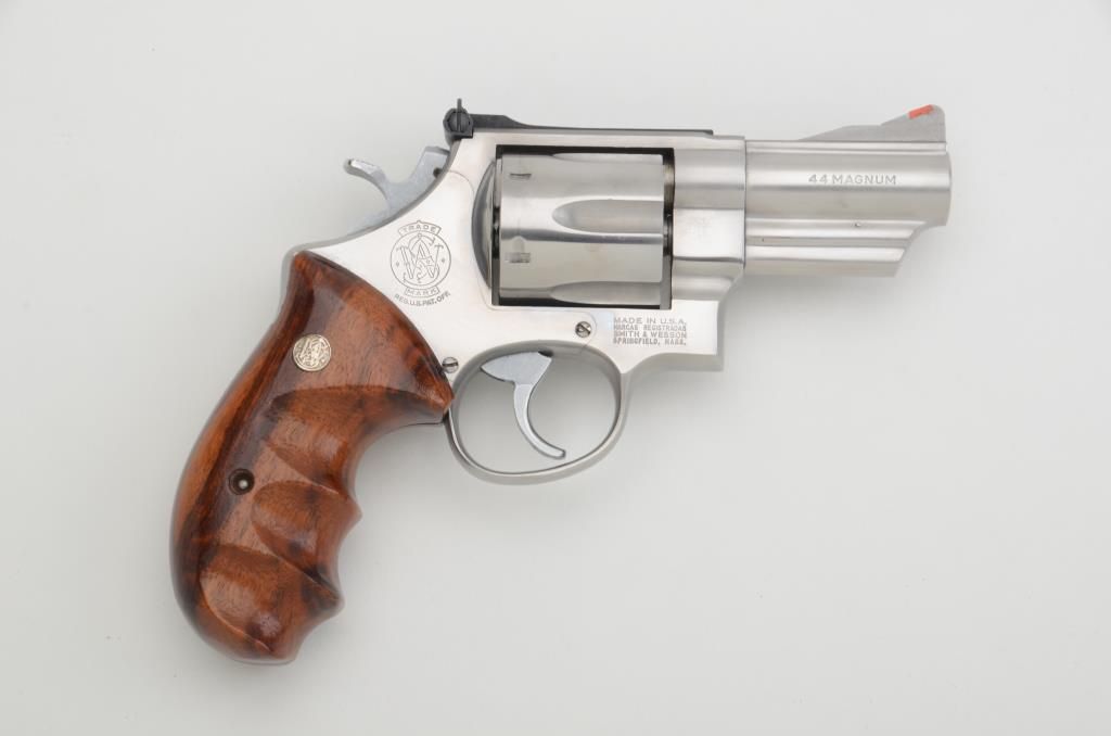 Smith & Wesson Model 629-1 DA revolver, .44 Magnum cal., 3” barrel, stainless, finger groove hardwood medallion grips, #AWD0101. This gun is in overall fine condition with a crisp action, fine bore, sharp markings, redinsert in front sight, adjustable rear sight and well-proportioned grips to handle this hand cannon. Est.: $350-$700.