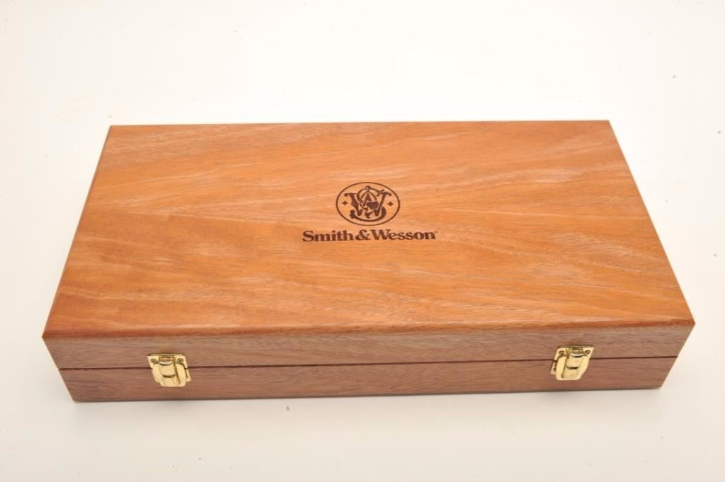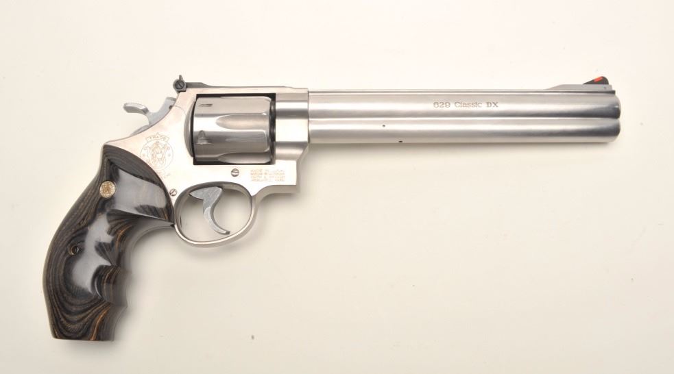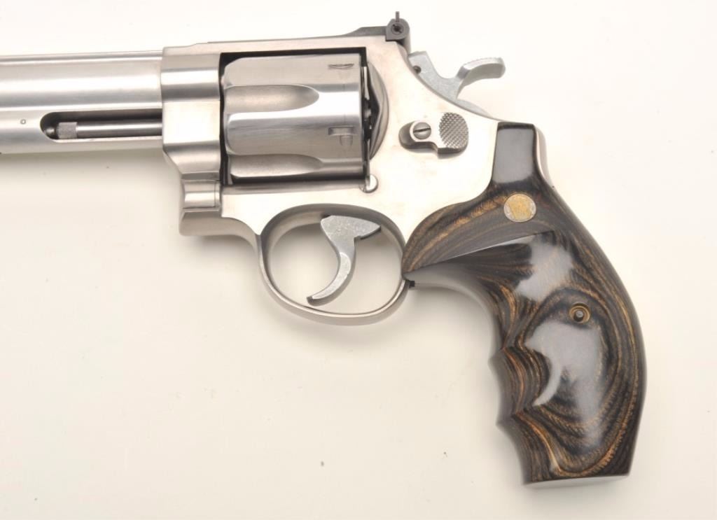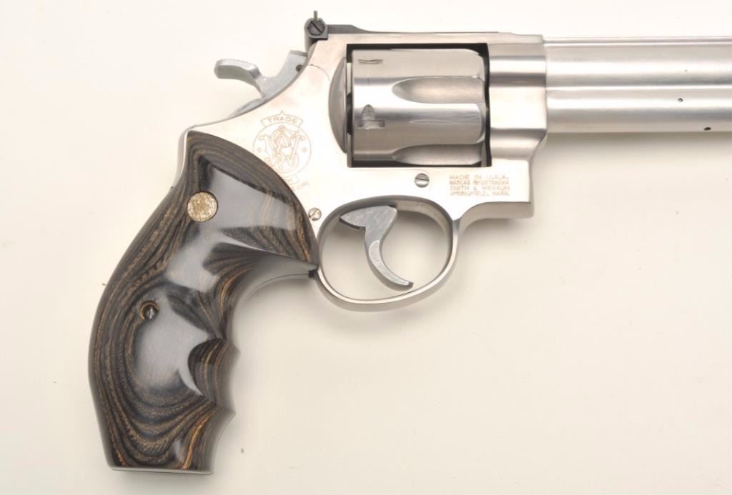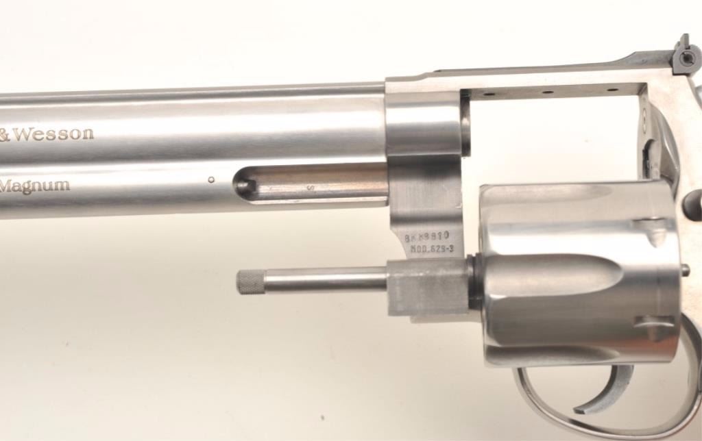 Smith & Wesson Model 629-3 Classic DX DA revolver, .44 Magnum caliber, 8.375” barrel, stainless steel, deluxe finger groove medallion wood grips, S/N BKK9810, in overall excellent condition showing minimal use, infactory cardboard box with cleaning accessories along with a S&W wood presentation case and cardboard shipping box. (Modern/PPT). Est.: $750-$1,500.